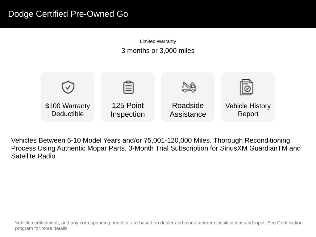 * Vehicles Between 6-10 Model Years and/or 75,001-120,000 Miles. Thorough Reconditioning Process Using Authentic Mopar Parts. 3-Month Trial Subscription for SiriusXM GuardianTM and Satellite Radio