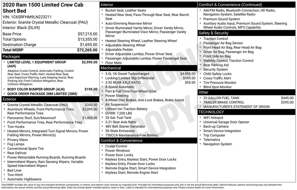 WELCOME TO DECEMBER AT CORWIN CHRYSLER DODGE JEEP RAM OF FARGO!! WE HAVE GREAT SAVINGS ON ALL OF OUR PRE-OWNED VEHICLES AVAILABLE!! WE HAVE ONE OF THE LARGEST SELECTION OF INVENTORIES IN OUR AREA AT ONE SINGLE LOCATION!! Priced below KBB Fair Purchase Price! Granite Crystal Metallic Clearcoat 2020 Ram 1500 Limited FACTORY CERTIFIED 4D Crew Cab 4WD EcoDiesel 3.0L V6 Certified. CARFAX One-Owner. Clean CARFAX.