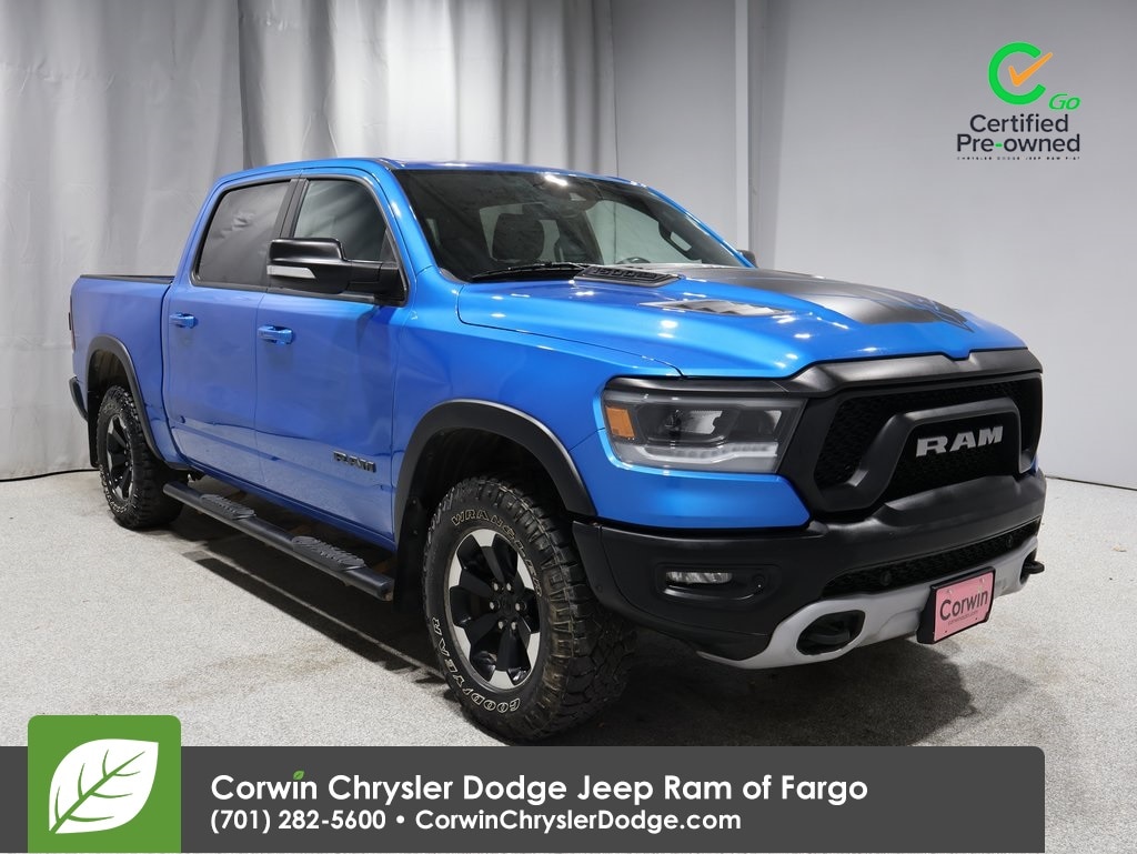 HAPPY FALL AT CORWIN CHRYSLER DODGE JEEP RAM OF FARGO!! WE HAVE GREAT SAVINGS ON ALL OF OUR PRE-OWNED VEHICLES AVAILABLE!! WE HAVE ONE OF THE LARGEST SELECTIONS OF INVENTORIES IN OUR AREA AT ONE LOCATION!! Hydro Blue Pearlcoat 2022 Ram 1500 Rebel FACTORY CERTIFIED 4D Crew Cab 4WD HEMI 5.7L V8 Multi Displacement VVT Certified. CARFAX One-Owner. Clean CARFAX.