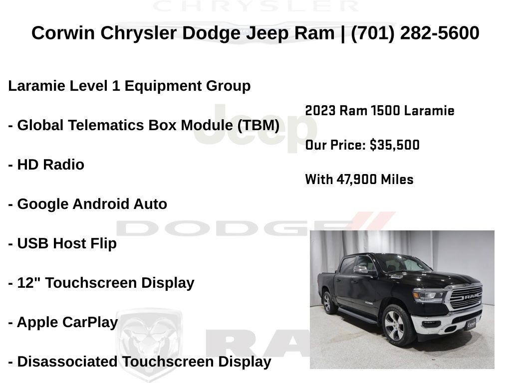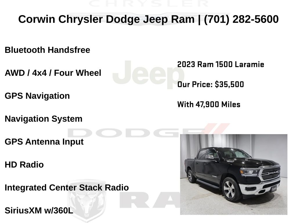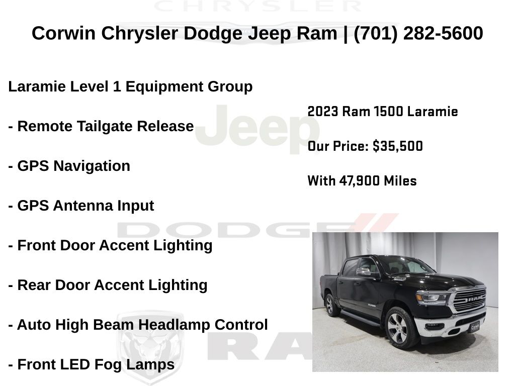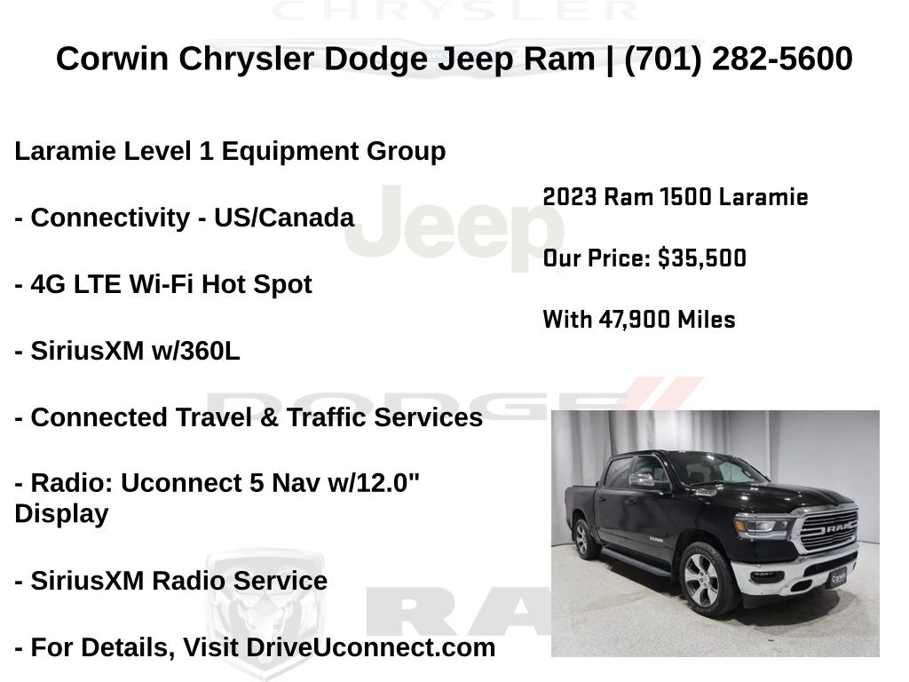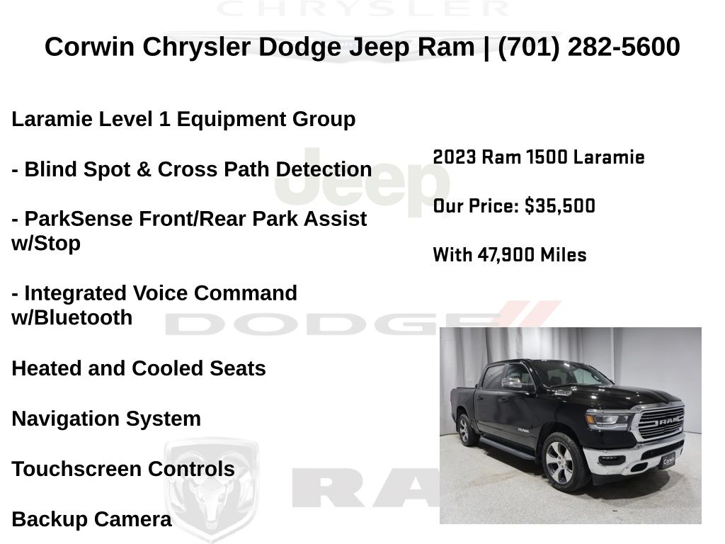 HAPPY JANUARY FROM CORWIN CHRYSLER DODGE JEEP RAM OF FARGO!! WE HAVE SAVINGS ON ALL OF OUR PRE-OWNED VEHICLES AVAILABLE!! WE HAVE ONE OF THE LARGEST SELECTIONS OF INVENTORIES IN OUR AREA AT ONE SINGLE LOCATION!! Priced below KBB Fair Purchase Price! Diamond Black Crystal Pearlcoat 2023 Ram 1500 Laramie FACTORY CERTIFIED 4D Crew Cab 4WD HEMI 5.7L V8 Multi Displacement VVT eTorque Certified. CARFAX One-Owner. Clean CARFAX.