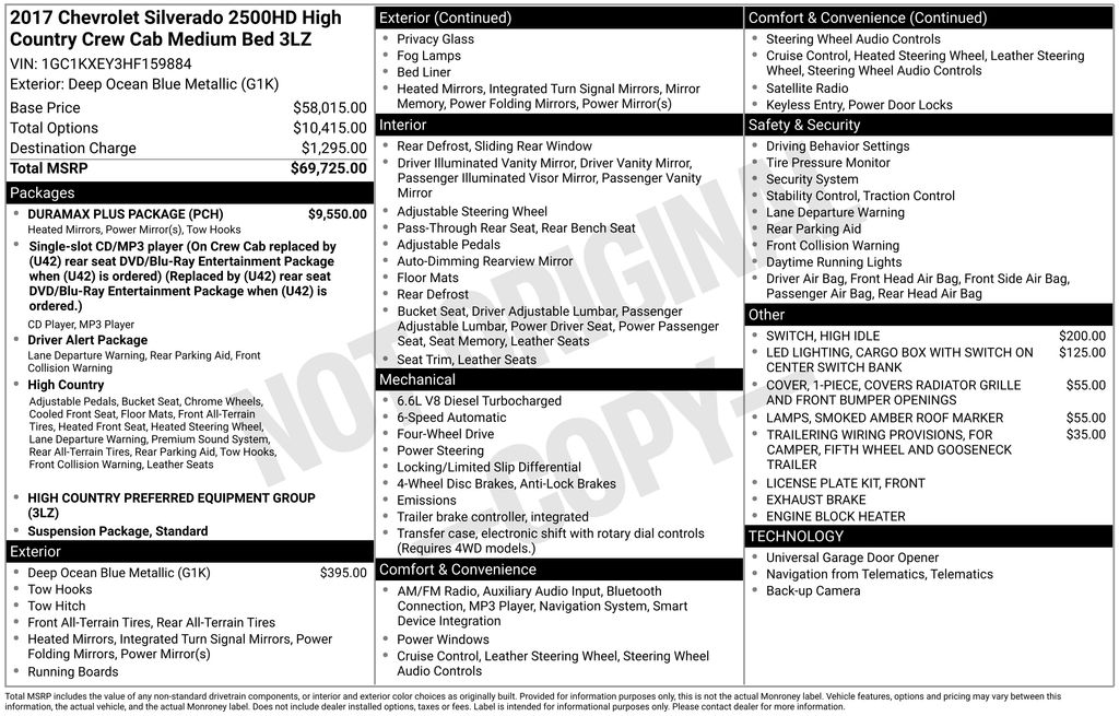 This Chevrolet Silverado 2500HD is well equipped and includes these key features and benefits, Heated and Cooled Seats, Navigation System, Touchscreen Controls, Backup Camera, Automatic Headlights, Bluetooth Handsfree, AWD / 4x4 / Four Wheel, 110-Volt AC Power Outlet, 4.2" Diagonal Color Display Driver Info Center, 6" Rectangular Chromed Assist Steps (LPO), Auto-Dimming Inside Rear-View Mirror, Bright Sill Plates, Chrome Bodyside Moldings, Chrome Door Handles, Chrome Mirror Caps, Chrome Power-Adjustable Heated Trailering Mirrors, Chrome Recovery Hooks, Color-Keyed Carpeting Floor Covering, Deep-Tinted Glass, Digital Steering Assist, Driver & Front Passenger Vanity Mirror Visors, Driver Alert Package, Dual-Zone Automatic Climate Control, Duramax Plus Package, Electric Rear-Window Defogger, Electronic Shift Transfer Case, Engine Block Heater, EZ-Lift & Lower Tailgate, Forward Collision Alert, Front Halogen Fog Lamps, HD Radio, Heated front seats, Heated Power-Adjustable Outside Mirrors, Lane Departure Warning System, Leather-Wrapped Steering Wheel, Manual Tilt-Wheel/Telescoping Steering Column, Navigation System, OnStar 3 Month Guidance Plan, OnStar 4G LTE Wi-Fi Hotspot, Power Sliding Rear Window w/Defogger, Power Windows w/Driver Express Up & Down, Preferred Equipment Group 3LZ, Rear 60/40 Folding Bench Seat (Folds Up), Rear Vision Camera, Rear Wheelhouse Liners, Remote Keyless Entry, Remote Locking Tailgate, Remote Vehicle Starter System, Single Slot CD/MP3 Player, SiriusXM Satellite Radio, Spray-On Pickup Box Bed Liner w/Bowtie Logo, Standard Suspension Package, Trailering Equipment, Unauthorized Entry Theft-Deterrent System, Universal Home Remote, Ventilated front seats. Odometer is 22721 miles below market average!