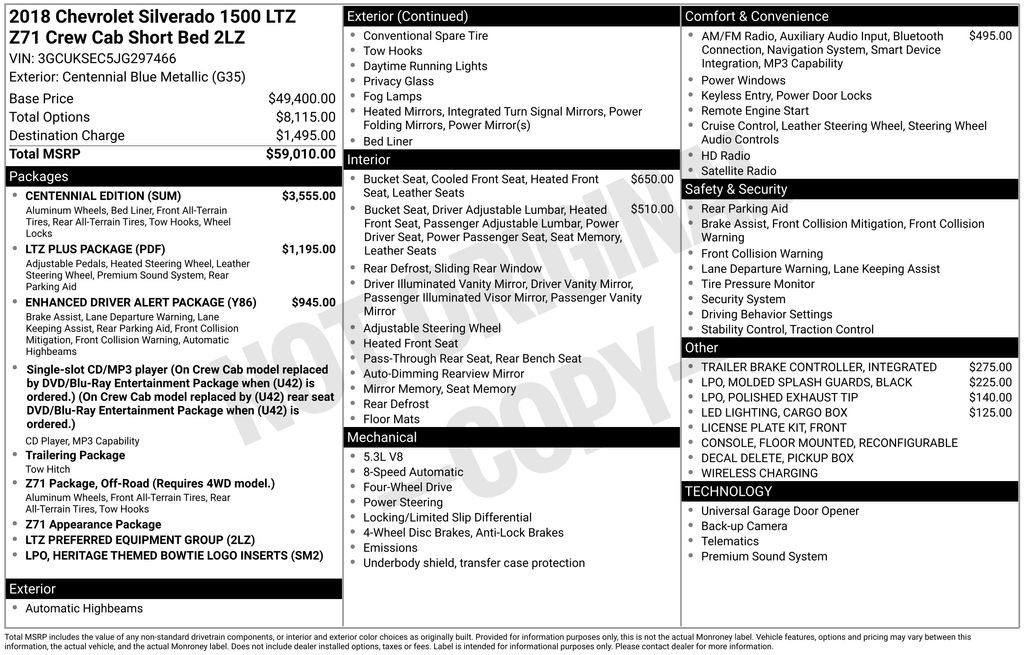 This Chevrolet Silverado 1500 is well equipped and includes these key features and benefits, Heated Seats, Touchscreen Controls, Backup Camera, Automatic Headlights, Bluetooth Handsfree, AWD / 4x4 / Four Wheel, 110-Volt AC Power Outlet, 150 Amp Alternator, 4.2" Diagonal Color Display Driver Info Center, 6 Speaker Audio System, Auto-Dimming Inside Rear-View Mirror, Auxiliary External Transmission Oil Cooler, Bluetooth® For Phone, Body Color Rear Bumper w/Cornersteps, Body-Color Grille Surround, Body-Color Headlamp Bezels, Chrome Bodyside Moldings, Chrome Cap Power-Adjustable Heated Outside Mirrors, Chrome Door Handles, Chrome Mirror Caps, Color-Keyed Carpeting w/Rubberized Vinyl Floor Mats, Deep-Tinted Glass, Driver & Front Passenger Illuminated Vanity Mirrors, Dual-Zone Automatic Climate Control, Enhanced Driver Alert Package, EZ Lift & Lower Tailgate, Forward Collision Alert, Front Body-Color Bumper, Front Chrome Bumper, Front Frame-Mounted Black Recovery Hooks, HD Radio, Heated front seats, Heavy-Duty Rear Locking Differential, Hill Descent Control, IntelliBeam Automatic High Beam On/Off Headlight, Lane Keep Assist, Leather Wrapped Heated Steering Wheel, Leather Wrapped Steering Wheel w/Cruise Controls, LED Taillamps w/Signature, Low Speed Forward Automatic Braking, LTZ Plus Package, Manual Tilt/Telescoping Steering Column, Off-Road Suspension Package, OnStar & Chevrolet Connected Services Capable, Power Adjustable Pedals, Power Sliding Rear Window, Power Windows w/Driver Express Up, Preferred Equipment Group 2LZ, Rear 60/40 Folding Bench Seat (Folds Up), Rear Chrome Bumper, Rear Wheelhouse Liners, Remote Keyless Entry, Remote Locking Tailgate, Remote Vehicle Starter System, Single Slot CD/MP3 Player, Spray-On Pickup Box Bed Liner, Steering Wheel Audio Controls, Theft Deterrent System (Unauthorized Entry), Thin Profile LED Fog Lamps, Trailering Package, Ultrasonic Front & Rear Park Assist, Universal Home Remote.