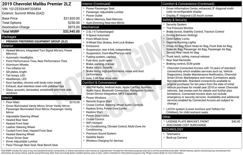 WELCOME TO DECEMBER AT CORWIN CHRYSLER DODGE JEEP RAM OF FARGO!! WE HAVE GREAT SAVINGS ON ALL OF OUR PRE-OWNED VEHICLES AVAILABLE!! WE HAVE ONE OF THE LARGEST SELECTIONS OF INVENTORIES IN OUR AREA AT ONE SINGLE LOCATION!! Priced below KBB Fair Purchase Price! Summit White 2019 Chevrolet Malibu Premier 4D Sedan FWD 2.0L 4-Cylinder DGI DOHC VVT Turbocharged CARFAX One-Owner. Clean CARFAX.
