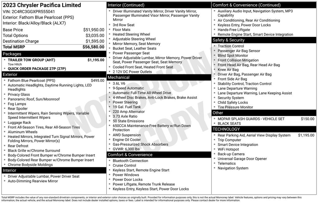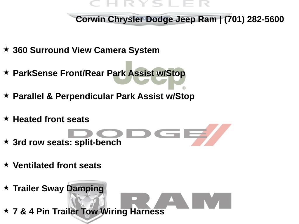 This Chrysler Pacifica is well equipped and includes these key features and benefits, Heated and Cooled Seats, Touchscreen Controls, Backup Camera, Automatic Headlights, Bluetooth Handsfree, Sunroof/Moonroof, AWD / 4x4 / Four Wheel, 360 Surround View Camera System, 3rd row seats: split-bench, 7 & 4 Pin Trailer Tow Wiring Harness, Front Splash Guards, Heated front seats, Hitch w/2" Receiver, MOPAR Splash Guards - Vehicle Set, Navigation System, Parallel & Perpendicular Park Assist w/Stop, ParkSense Front/Rear Park Assist w/Stop, Power Liftgate, Power moonroof, Quick Order Package 27P, Rear Splash Guards, Safety Sphere, Trailer Sway Damping, Trailer Tow Group, Ventilated front seats. Odometer is 11354 miles below market average!