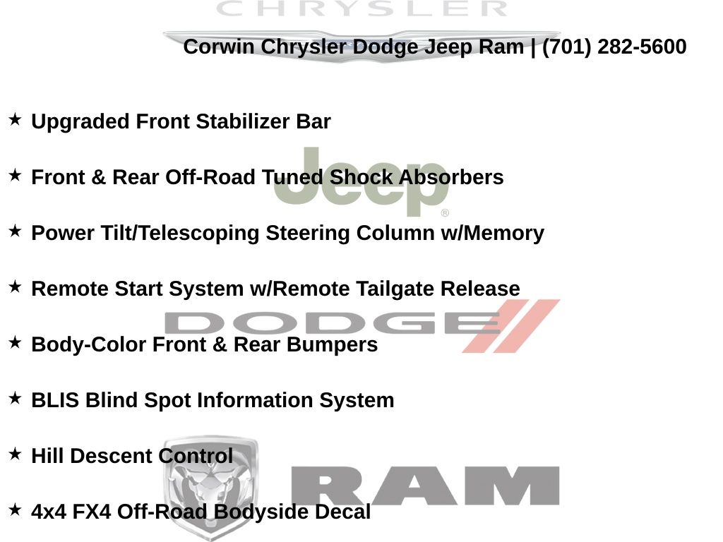 Corwin is the largest Chrysler Dodge Jeep Ram dealer in the region! We have a huge selection of new & used vehicles with financing options for everyone. Here at Corwin Chrysler Dodge Jeep Ram we're not only here to help you find your next car, we are your go-to source for all things automotive! Our expert dealership staff is here to help you with auto financing, car maintenance and repairs, or even finding the right parts for your next DIY project. Stop by our new and used car dealership in Fargo today and find out why folks keep coming back! We're here to help you get into the vehicle of your dreams and keep it running its best for many miles. Corwin Chrysler Dodge Jeep Ram 301 38th St S, Fargo, North Dakota CorwinChryslerDodge.com Corwin - Family Driven for Over 100 YearS.