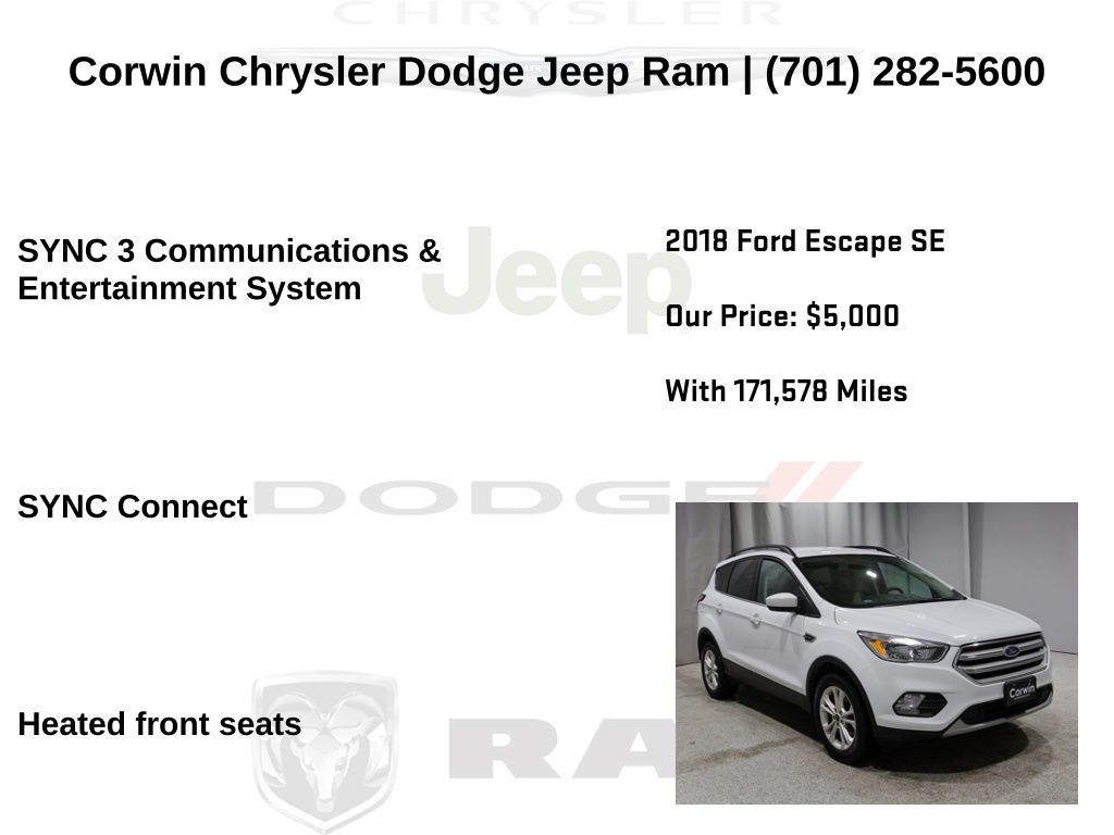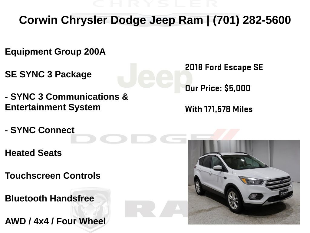 HAPPY NEW YEARS FROM CORWIN CHRYSLER DODGE JEEP RAM OF FARGO!! WE HAVE SAVINGS ON ALL OF OUR PRE-OWNED VEHICLES AVAILABLE!! WE HAVE ONE OF THE LARGEST SELECTION OF INVENTORIES IN OUR AREA AT ONE SINGLE LOCATION!! Priced below KBB Fair Purchase Price! Oxford White 2018 Ford Escape SE 4D Sport Utility 4WD EcoBoost 2.0L I4 GTDi DOHC Turbocharged VCT Clean CARFAX.