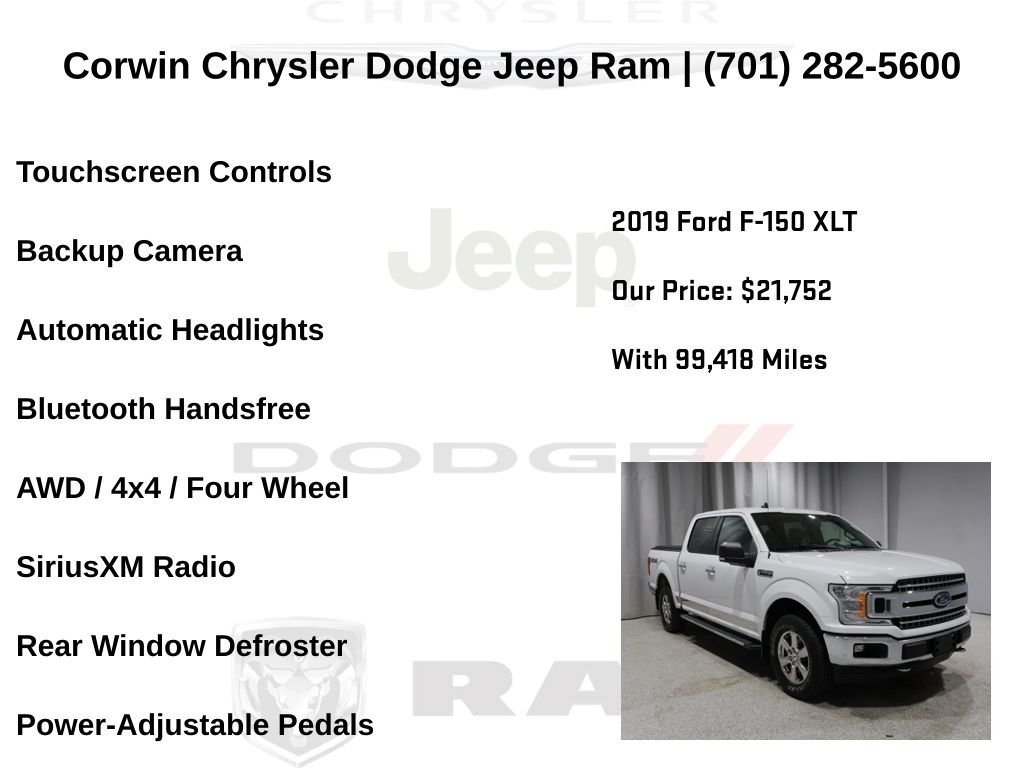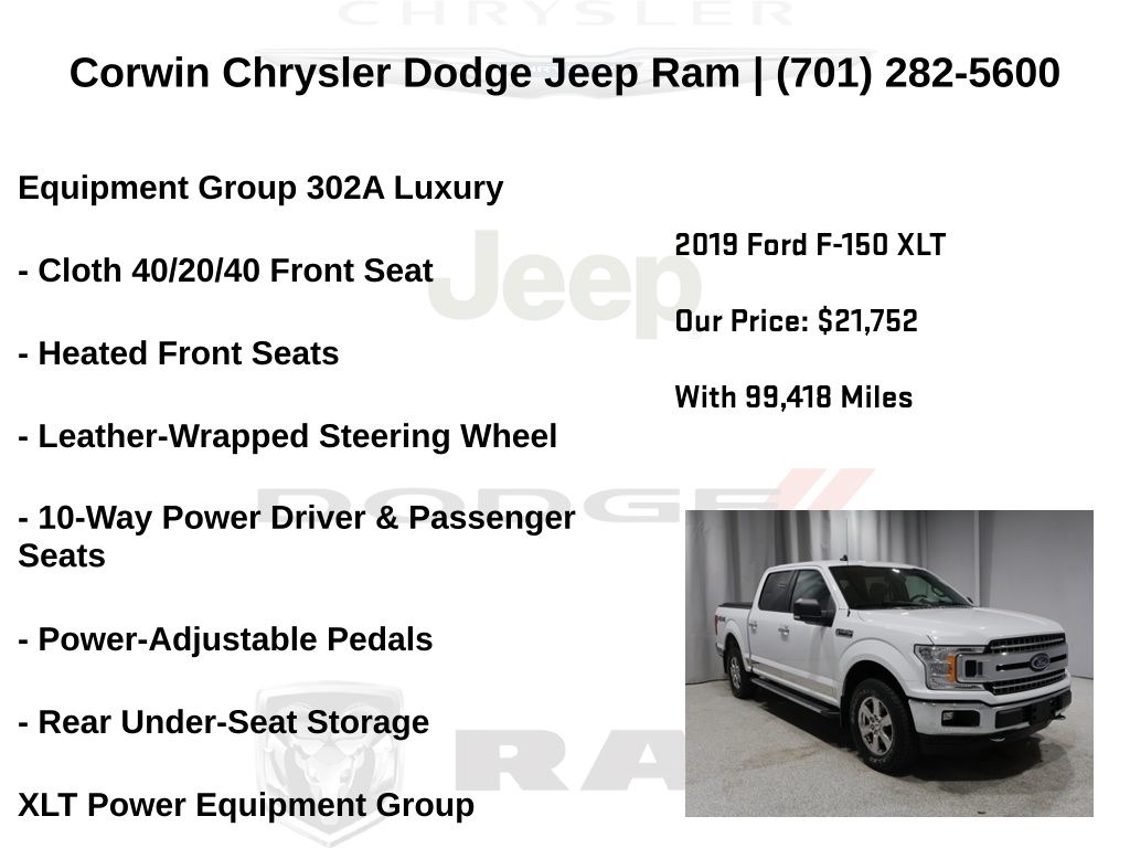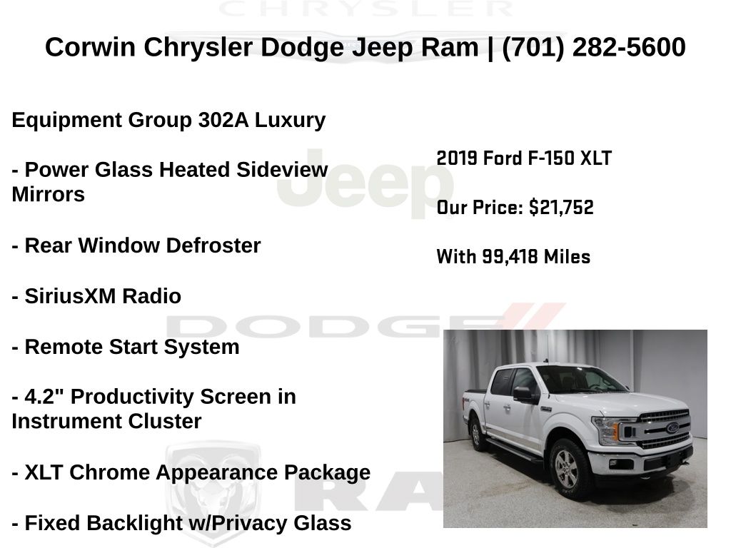 WELCOME TO DECEMBER AT CORWIN CHRYSLER DODGE JEEP RAM OF FARGO!! WE HAVE GREAT SAVINGS ON ALL OF OUR PRE-OWNED VEHICLES AVAILABLE!! WE HAVE ONE OF THE LARGEST SELECTION OF INVENTORIES IN OUR AREA AT ONE SINGLE LOCATION!! Priced below KBB Fair Purchase Price! Oxford White 2019 Ford F-150 XLT 4D SuperCrew 4WD 5.0L V8