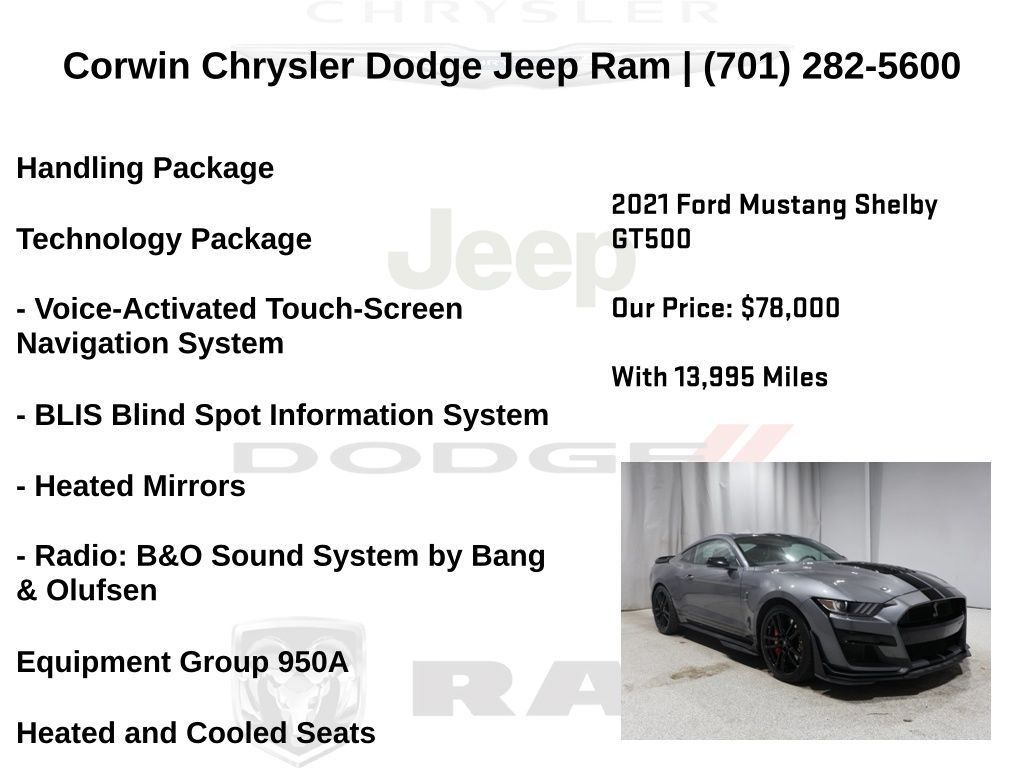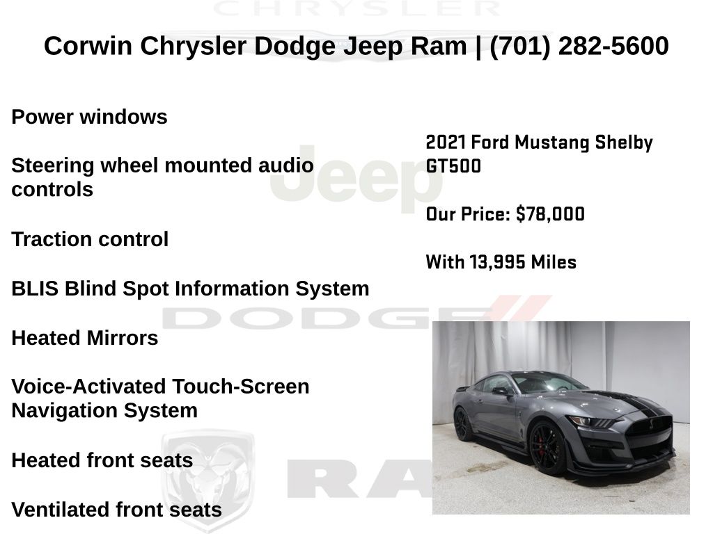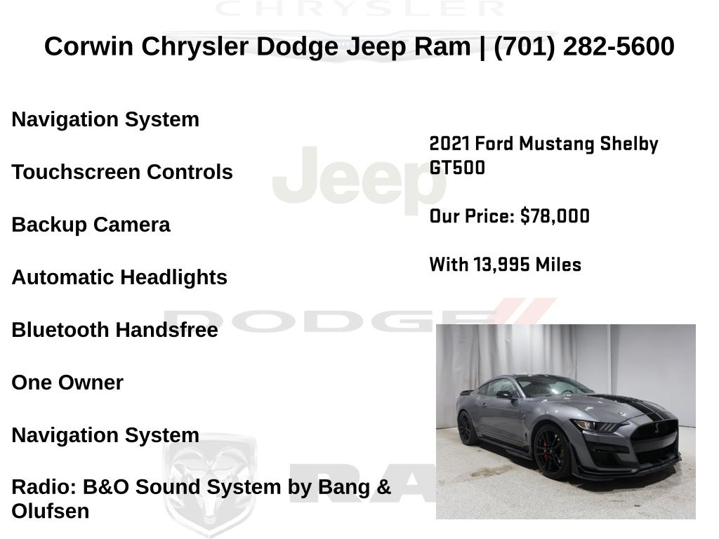 HAPPY NEW YEARS FROM CORWIN CHRYSLER DODGE JEEP RAM OF FARGO!! WE HAVE SAVINGS ON ALL OF OUR PRE-OWNED VEHICLES AVAILABLE!! WE HAVE ONE OF THE LARGEST SELECTION OF INVENTORIES IN OUR AREA AT ONE SINGLE LOCATION!! Priced below KBB Fair Purchase Price! Carbonized Gray Metallic 2021 Ford Mustang Shelby GT500 2D Coupe RWD 5.2L V8 CARFAX One-Owner. Clean CARFAX.