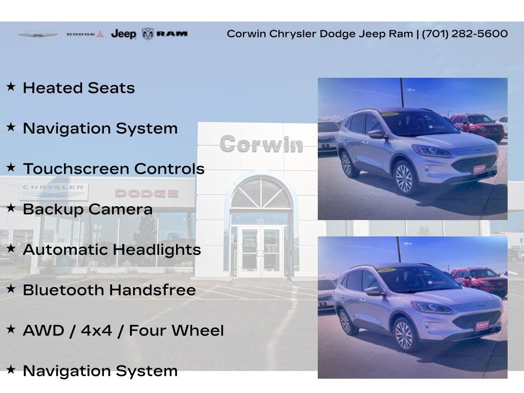 LETS MARCH INTO SPRING AT CORWIN CHRYSLER DODGE JEEP RAM OF FARGO!! WE HAVE SAVINGS ON ALL OF OUR PRE-OWNED VEHICLES AVAILABLE!! WE HAVE ONE OF THE LARGEST SELECTIONS OF INVENTORIES IN OUR AREA AT ONE SINGLE LOCATION!! Recent Arrival! Silver Metallic 2022 Ford Escape Titanium 4D Sport Utility AWD EcoBoost 2.0L I4 GTDi DOHC Turbocharged VCT Clean CARFAX.