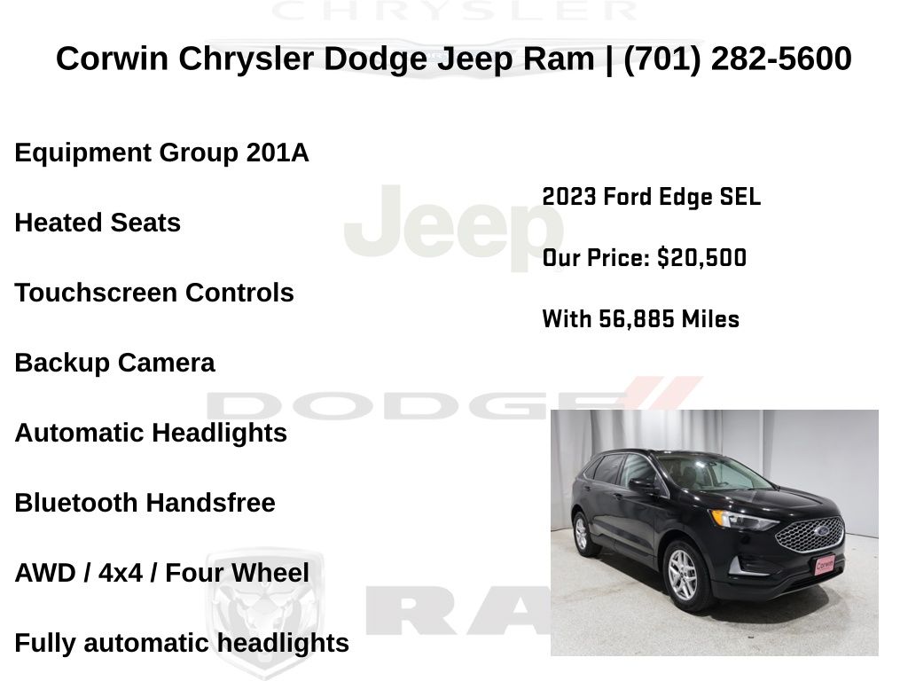 WELCOME TO DECEMBER AT CORWIN CHRYSLER DODGE JEEP RAM OF FARGO!! WE HAVE GREAT SAVINGS ON ALL OF OUR PRE-OWNED VEHICLES AVAILABLE!! WE HAVE ONE OF THE LARGEST SELECTIONS OF INVENTORIES IN OUR AREA AT ONE SINGLE LOCATION!! Priced below KBB Fair Purchase Price! Black Metallic 2023 Ford Edge SEL 4D Sport Utility AWD EcoBoost 2.0L I4 GTDi DOHC Turbocharged VCT CARFAX One-Owner. Clean CARFAX.