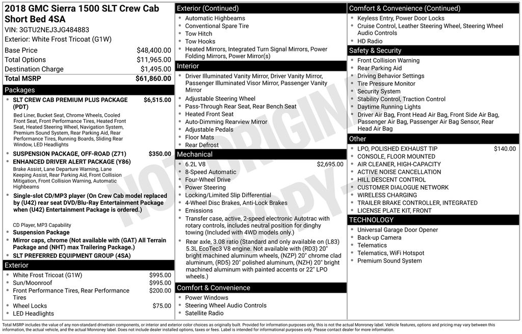 This GMC Sierra 1500 is well equipped and includes these key features and benefits, Heated Seats, Touchscreen Controls, Backup Camera, Automatic Headlights, Bluetooth Handsfree, AWD / 4x4 / Four Wheel, 110-Volt AC Power Outlet, 150 Amp Alternator, 1st & 2nd Row Color-Keyed Carpeted Floor Mats, 2-Speed Active Electronic AutoTrac Transfer Case, 20" x 9" Chrome Clad Aluminum Wheels, 4.2" Diagonal Color Display Driver Info Center, 6" Rectangular Chromed Tubular Assist Steps, Auto-Dimming Inside Rear-View Mirror, Auxiliary External Transmission Oil Cooler, Bose Speaker System, Chrome Bodyside Moldings, Chrome Door Handles, Chrome Mirror Caps, Color-Keyed Carpeting, Deep-Tinted Glass, Driver & Front Passenger Illuminated Vanity Mirrors, Dual-Zone Automatic Climate Control, Electric Rear-Window Defogger, Enhanced Driver Alert Package, EZ Lift & Lower Tailgate, Forward Collision Alert, Front Frame-Mounted Black Recovery Hooks, Front Full Feature Power Reclining Bucket Seats, GMC 4G LTE, Heated & Ventilated Front Bucket Seats, Heated front seats, Heavy-Duty Rear Locking Differential, High-Performance LED Headlamps, Hill Descent Control, Integrated Trailer Brake Controller, IntelliBeam Automatic High Beam On/Off Headlight, Lane Keep Assist, Leather Wrapped Heated Steering Wheel, Leather Wrapped Steering Wheel w/Cruise Controls, LED Cargo Box Lighting, LED Tailamps w/Signature, Low Speed Forward Automatic Braking, Manual Tilt/Telescoping Steering Column, Off-Road Suspension Package, OnStar & GMC Connected Services Capable, Power Adjustable Pedals, Power Folding & Adjustable Heated Outside Mirrors, Power Sliding Rear Window w/Defogger, Power Windows w/Driver Express Up & Down, Preferred Equipment Group 4SA, Radio: AM/FM/GMC Infotainment & Navigation, Rear 60/40 Folding Bench Seat (Folds Up), Rear Wheelhouse Liners, Remote Keyless Entry, Remote Vehicle Starter System, Single Slot CD/MP3 Player, SLT Crew Cab Premium Plus Package, Spray-On Pickup Box Bed Liner w/GMC Logo, Steering Wheel Audio Controls, Theft Deterrent System (Unauthorized Entry), Thin Profile LED Fog Lamps, Trailering Equipment, Ultrasonic Front & Rear Park Assist, Universal Home Remote.