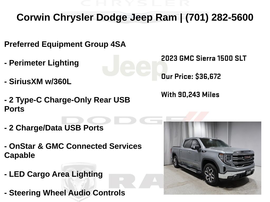 DECEMBER IS HERE AT CORWIN CHRYSLER DODGE JEEP RAM OF FARGO!! WE HAVE STOCKINGS FULL OF SAVINGS ON ALL OF OUR PRE-OWNED VEHICLES AVAILABLE!! WE HAVE ONE OF THE LARGEST SELECTION OF INVENTORIES IN OUR AREA AT ONE SINGLE LOCATION!! Priced below KBB Fair Purchase Price! Sterling Metallic 2023 GMC Sierra 1500 SLT 4D Crew Cab 4WD 3.0L I6 CARFAX One-Owner. Clean CARFAX.