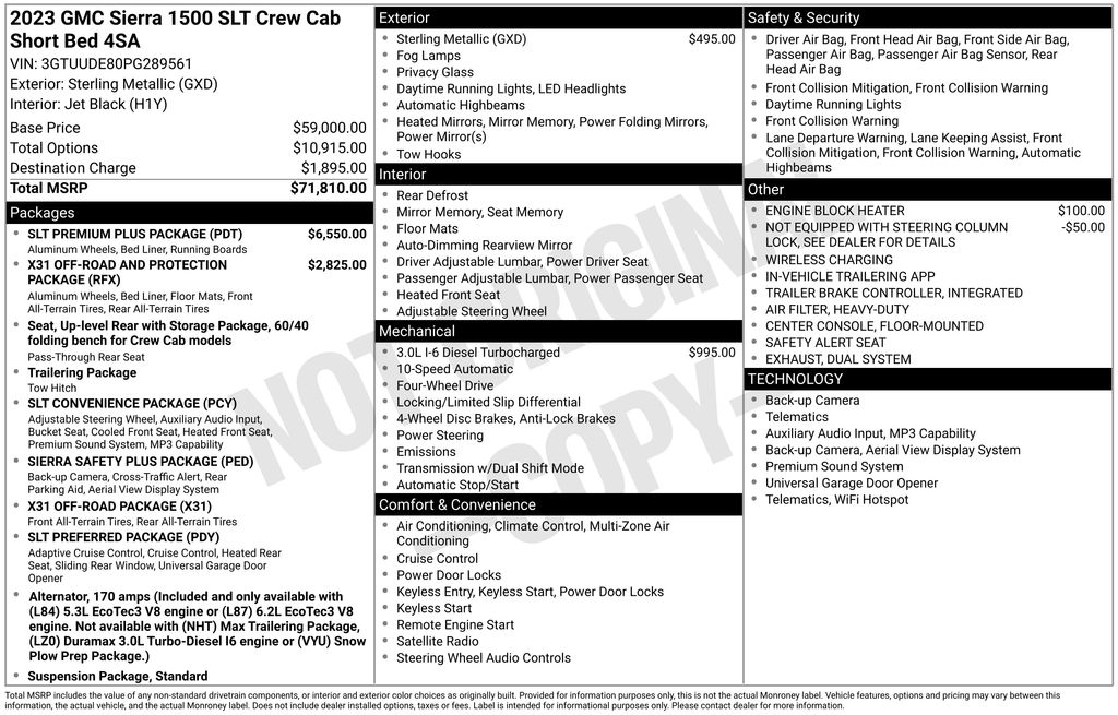 This GMC Sierra 1500 is well equipped and includes these key features and benefits, Heated Seats, Touchscreen Controls, Backup Camera, Automatic Headlights, Bluetooth Handsfree, One Owner, AWD / 4x4 / Four Wheel, 120-Volt Instrument Panel Power Outlet, 170 Amp Alternator, 2 Charge/Data USB Ports, 2 Type-C Charge-Only Rear USB Ports, 20" Polished Aluminum Wheels, 6-Speaker Audio System Feature, Adaptive Cruise Control, All-Weather Floor Liner (LPO), Auto-Locking Rear Differential, Auxiliary External Transmission Oil Cooler, Chrome Header & Chrome Grille Insert Bars, Chrome Wheel To Wheel Assist Steps, Color-Keyed Carpeting Floor Covering, Compass, Deep-Tinted Glass, Dual Exhaust System, Electric Rear-Window Defogger, Electrical Steering Column Lock, Floor-Mounted Center Console, Front Bucket Seats, Front Frame-Mounted Black Recovery Hooks, Front Rainsensing Wipers, GMC Connected Access Capable, HD Rear Vision Camera, HD Surround Vision, Heated 2nd Row Outboard Seats, Heated front seats, Heavy-Duty Air Filter, High Capacity Suspension Package, Hill Descent Control, Hitch Guidance w/Hitch View, In-Vehicle Trailering App, Integrated Trailer Brake Controller, Keyless Open & Start, LED Cargo Area Lighting, Manual Tilt-Wheel & Telescoping Steering Column, Navigation System, Off-Road Suspension, OnStar & GMC Connected Services Capable, Perimeter Lighting, Power Door Locks, Power Front Passenger Windows w/Express Up/Down, Power Front Windows w/Driver Express Up/Down, Power Rake & Telescoping Steering Column, Power Rear Windows w/Express Down, Power Sliding Rear Window w/Rear Defogger, Preferred Equipment Group 4SA, Premium Bose 7-Speaker Sound System, ProGrade Trailering System, Push Button Start, Rear Cross Traffic Braking, Rear Pedestrian Detection, Rear Wheelhouse Liners, Remote Vehicle Starter System, Safety Alert Seat, Sierra Safety Plus Package, SiriusXM w/360L, SLT Convenience Package, SLT Preferred Package, SLT Premium Plus Package, Spray-On Pickup Bed Liner w/GMC Logo, Standard Suspension Package, Steering Wheel Audio Controls, Theft Deterrent System (Unauthorized Entry), Trailer Camera Provisions, Trailer Side Blind Zone Alert, Trailering Package, Ultrasonic Front & Rear Park Assist, Universal Home Remote, Ventilated Driver & Front Passenger Seats, Wheels: 20" Polished Aluminum w/RFX, Wi-Fi Hotspot Capable, Wireless Charging, Wireless Phone Projection, X31 Hard Badge, X31 Off-Road & Protection Package, X31 Off-Road Package. 22/27 City/Highway MPG