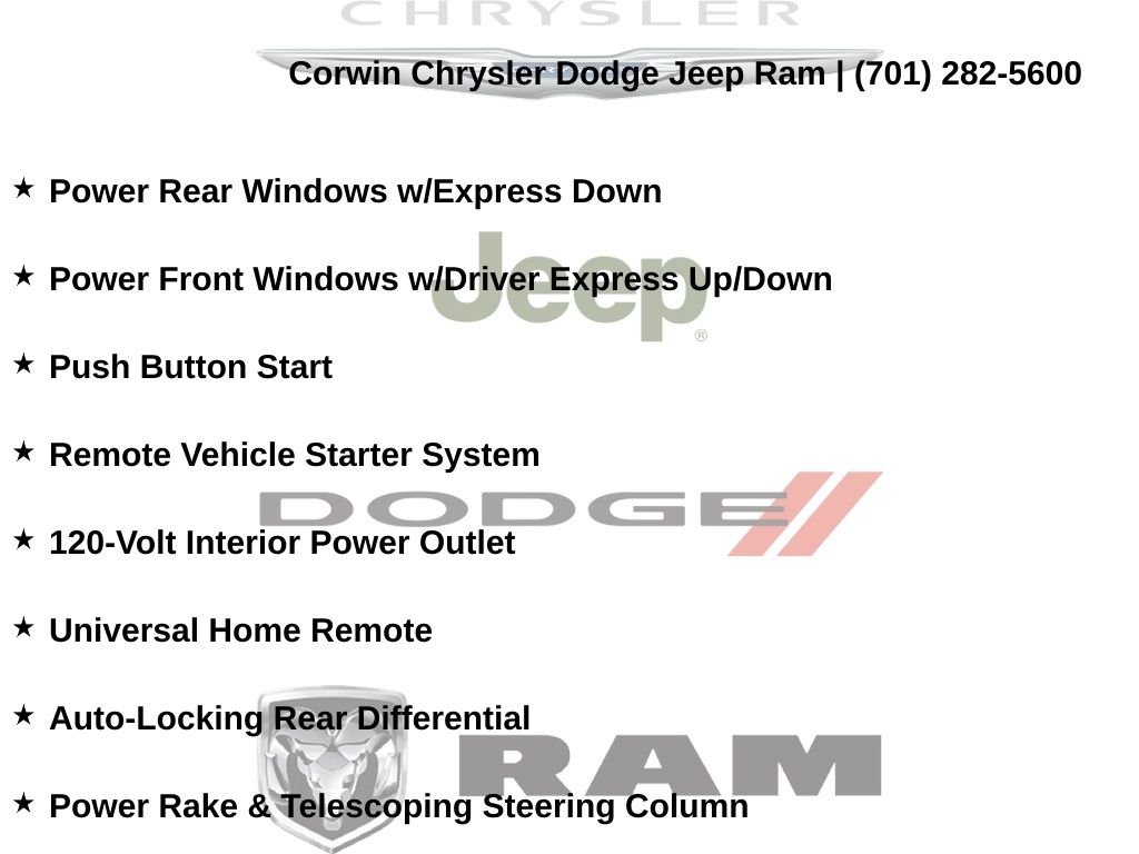 Corwin is the largest Chrysler Dodge Jeep Ram dealer in the region! We have a huge selection of new & used vehicles with financing options for everyone. Here at Corwin Chrysler Dodge Jeep Ram we're not only here to help you find your next car, we are your go-to source for all things automotive! Our expert dealership staff is here to help you with auto financing, car maintenance and repairs, or even finding the right parts for your next DIY project. Stop by our new and used car dealership in Fargo today and find out why folks keep coming back! We're here to help you get into the vehicle of your dreams and keep it running its best for many miles. Corwin Chrysler Dodge Jeep Ram 301 38th St S, Fargo, North Dakota CorwinChryslerDodge.com Corwin - Family Driven for Over 100 YearS.