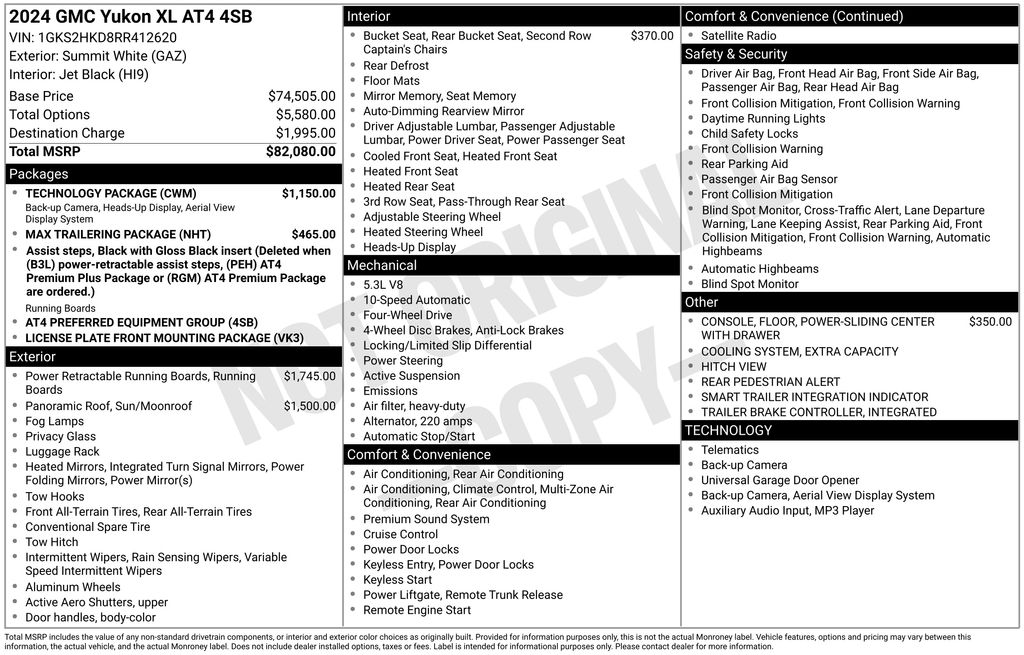 This GMC Yukon XL is well equipped and includes these key features and benefits, Heated and Cooled Seats, Navigation System, Touchscreen Controls, Backup Camera, Automatic Headlights, Bluetooth Handsfree, One Owner, AWD / 4x4 / Four Wheel, 12-Way Power Seat Adjusters, 15" Diagonal Multi-Color Head-Up Display, 2 Presets For Outside Rearview Mirrors, 3rd Row 60/40 Power-Folding Split-Bench Seat, Black Roof-Mounted Luggage Rack Side Rails, Bose 9-Speaker Stereo Audio System Feature, Bright Front & Rear Door Sill Plates, Dual-Pane Panoramic Power Sunroof, Extra Capacity Cooling System, Front High-Approach Angle Fascia, Hands-Free Power Programmable Rear Liftgate, HD Surround Vision, Heated 2nd Row Outboard Position Seats, Heated Driver & Front Passenger Seats, Heated Steering Wheel, Heavy-Duty Air Filter, Hill Descent Control, Inside Rear-View Auto-Dimming Mirror, License Plate Front Mounting Package, Max Trailering Package, Navigation System, Outside Heated Power-Adjustable Mirrors, Perforated Heated & Ventilated Dr & Frt Pass Seats, Power Release 2nd Row 60/40 Split-Folding Bench Seat, Power Tilt & Telescopic Steering Column, Preferred Equipment Group 4SB, Rear Pedestrian Alert, Red Horizontal-Mounted Recovery Hooks, Safety Alert Seat, Technology Package, Universal Home Remote, Ventilated front seats, Wireless Charging.