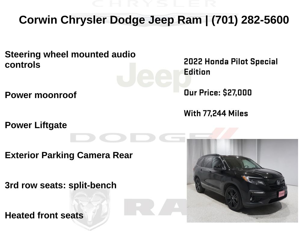 WELCOME TO DECEMBER AT CORWIN CHRYSLER DODGE JEEP RAM OF FARGO!! WE HAVE GREAT SAVINGS ON ALL OF OUR PRE-OWNED VEHICLES AVAILABLE!! WE HAVE ONE OF THE LARGEST SELECTIONS OF INVENTORIES IN OUR AREA AT ONE SINGLE LOCATION!! Priced below KBB Fair Purchase Price! Black 2022 Honda Pilot Special Edition 4D Sport Utility AWD 3.5L V6 24V SOHC i-VTEC Clean CARFAX.