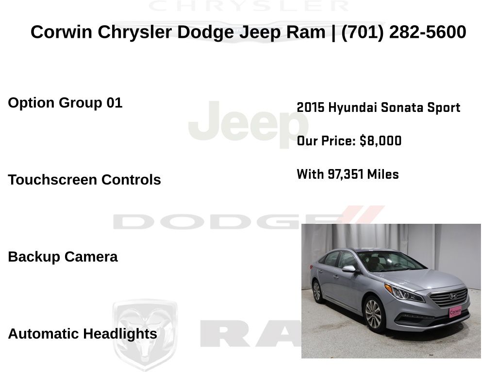 WELCOME TO DECEMBER AT CORWIN CHRYSLER DODGE JEEP RAM OF FARGO!! WE HAVE GREAT SAVINGS ON ALL OF OUR PRE-OWNED VEHICLES AVAILABLE!! WE HAVE ONE OF THE LARGEST SELECTIONS OF INVENTORIES IN OUR AREA AT ONE SINGLE LOCATION!! Priced below KBB Fair Purchase Price! Shale Gray Metallic 2015 Hyundai Sonata Sport 4D Sedan FWD 2.4L I4 DGI DOHC 16V ULEV II 185hp Clean CARFAX.