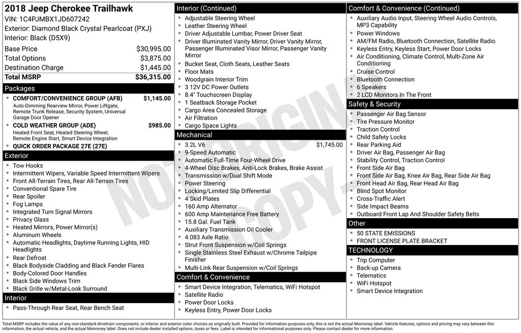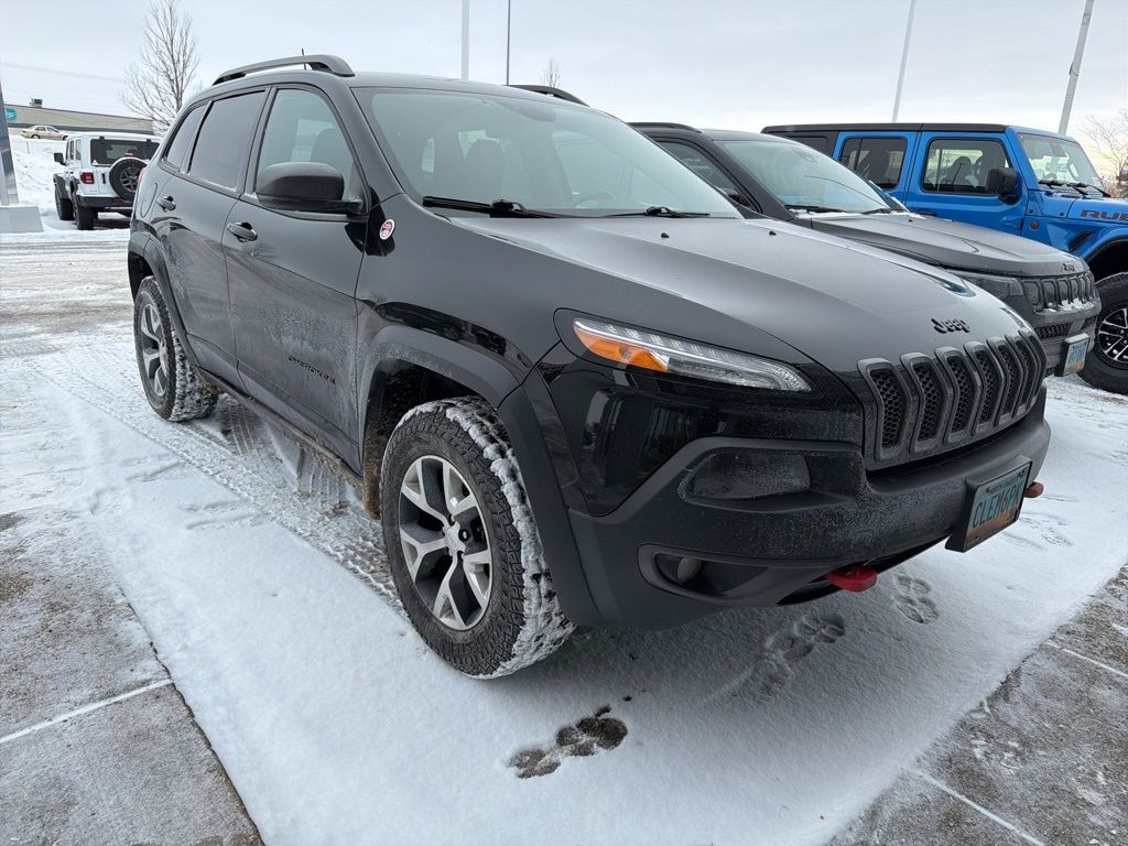 This Jeep Cherokee is well equipped and includes these key features and benefits, Heated Seats, Touchscreen Controls, Backup Camera, Automatic Headlights, Bluetooth Handsfree, AWD / 4x4 / Four Wheel, 3.517 Axle Ratio, Auto-Dimming Rear-View Mirror, Cold Weather Group, Comfort/Convenience Group, Engine Block Heater, Heated Front Seats, Heated Steering Wheel, Jeep Rack Off Road Accessory Kit, Power Liftgate, Quick Order Package 27E, Remote Start System, Security Alarm, Universal Garage Door Opener, Windshield Wiper De-Icer.