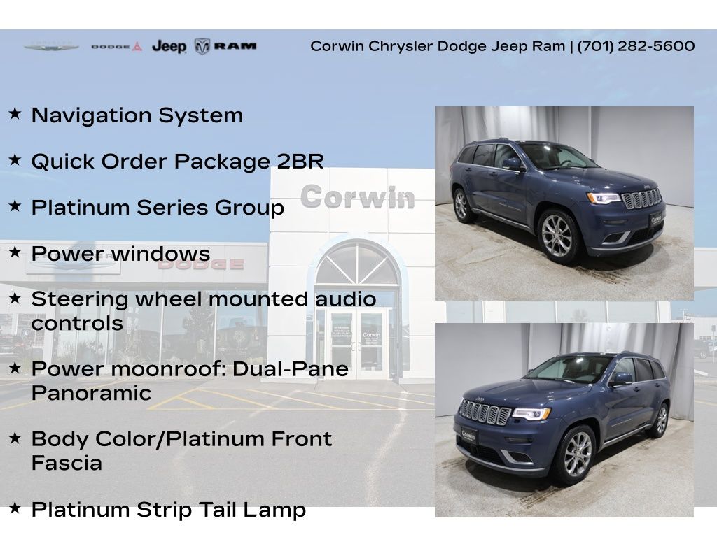 EMBRACE THE SHORTEST MONTH OF THE YEAR WITH CORWIN CHRYSLER DODGE JEEP RAM OF FARGO! WE HAVE SAVINGS ON ALL OF OUR PRE-OWNED VEHICLES AVAILABLE!! WE HAVE ONE OF THE LARGEST SELECTIONS OF INVENTORIES IN OUR AREA AT ONE SINGLE LOCATION!! Priced below KBB Fair Purchase Price! Pacific Blue Clearcoat 2019 Jeep Grand Cherokee Summit 4D Sport Utility 4WD 3.6L V6 24V VVT CARFAX One-Owner.