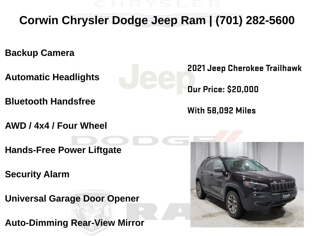 HAPPY NEW YEARS FROM CORWIN CHRYSLER DODGE JEEP RAM OF FARGO!! WE HAVE SAVINGS ON ALL OF OUR PRE-OWNED VEHICLES AVAILABLE!! WE HAVE ONE OF THE LARGEST SELECTION OF INVENTORIES IN OUR AREA AT ONE SINGLE LOCATION!! Sangria Metallic Clearcoat 2021 Jeep Cherokee Trailhawk FACTORY CERTIFIED 4D Sport Utility 4WD 3.2L V6 Certified. Clean CARFAX.