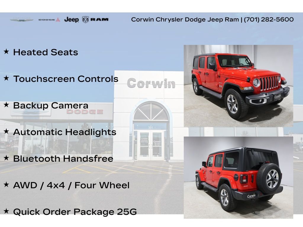 This Jeep Wrangler is well equipped and includes these key features and benefits, Heated Seats, Touchscreen Controls, Backup Camera, Automatic Headlights, Bluetooth Handsfree, AWD / 4x4 / Four Wheel, Quick Order Package 25G. Odometer is 2124 miles below market average!