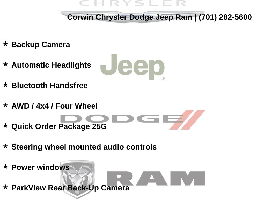 This Jeep Wrangler is well equipped and includes these key features and benefits, Backup Camera, Automatic Headlights, Bluetooth Handsfree, AWD / 4x4 / Four Wheel, Fully automatic headlights, ParkView Rear Back-Up Camera, Power windows, Quick Order Package 25G, Steering wheel mounted audio controls.