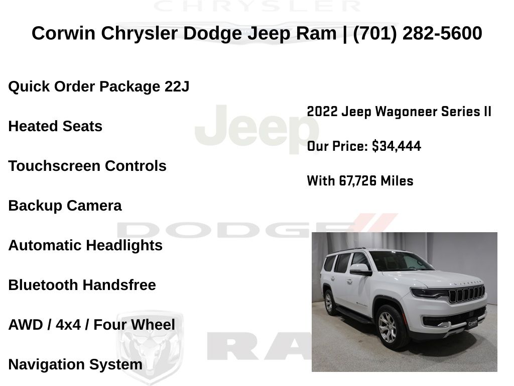 MARCHING INTO SPRING AT CORWIN CHRYSLER DODGE JEEP RAM OF FARGO!! WE HAVE SAVINGS ON ALL OF OUR PRE-OWNED VEHICLES AVAILABLE!! WE HAVE ONE OF THE LARGEST SELECTIONS OF INVENTORIES IN OUR AREA AT ONE SINGLE LOCATION!! Priced below KBB Fair Purchase Price! Bright White Clearcoat 2022 Jeep Wagoneer Series II 4D Sport Utility 4WD 5.7L V8 Clean CARFAX.