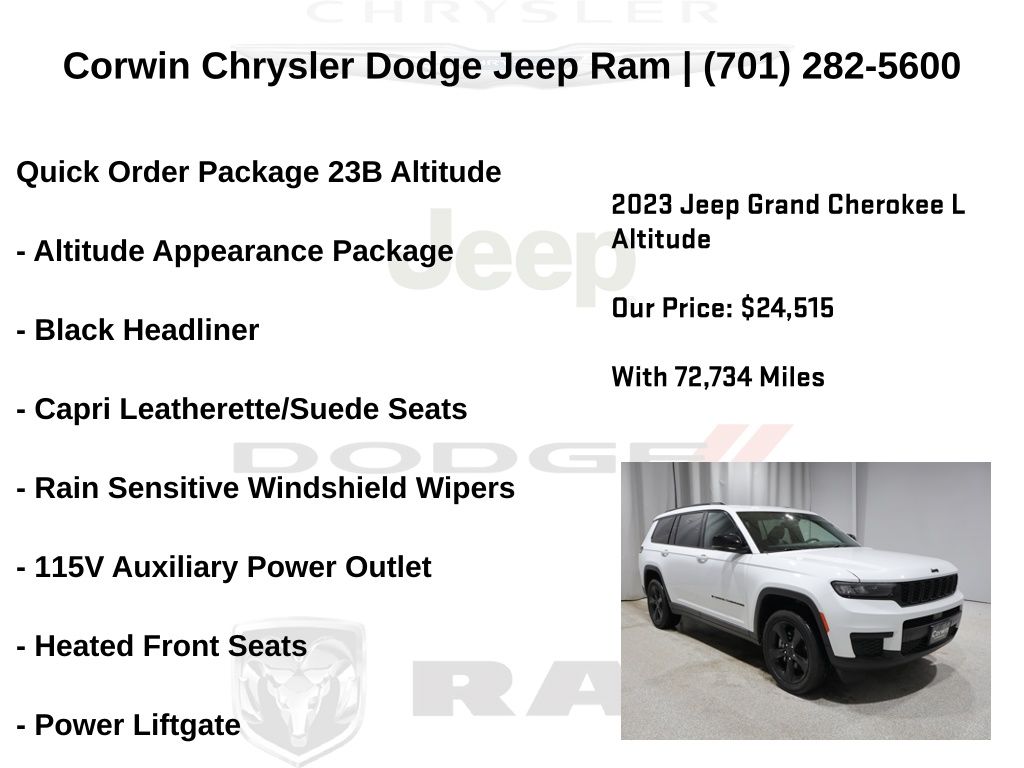 TIME TO SPRING INTO APRIL AT CORWIN CHRYSLER DODGE JEEP RAM OF FARGO!! WE HAVE SAVINGS ON ALL OF OUR PRE-OWNED VEHICLES AVAILABLE!! WE HAVE ONE OF THE LARGEST SELECTIONS OF INVENTORIES IN OUR AREA AT ONE SINGLE LOCATION !! Priced below KBB Fair Purchase Price! Bright White Clearcoat 2023 Jeep Grand Cherokee L Altitude 4D Sport Utility 4WD 3.6L V6 24V VVT CARFAX One-Owner. Clean CARFAX.
