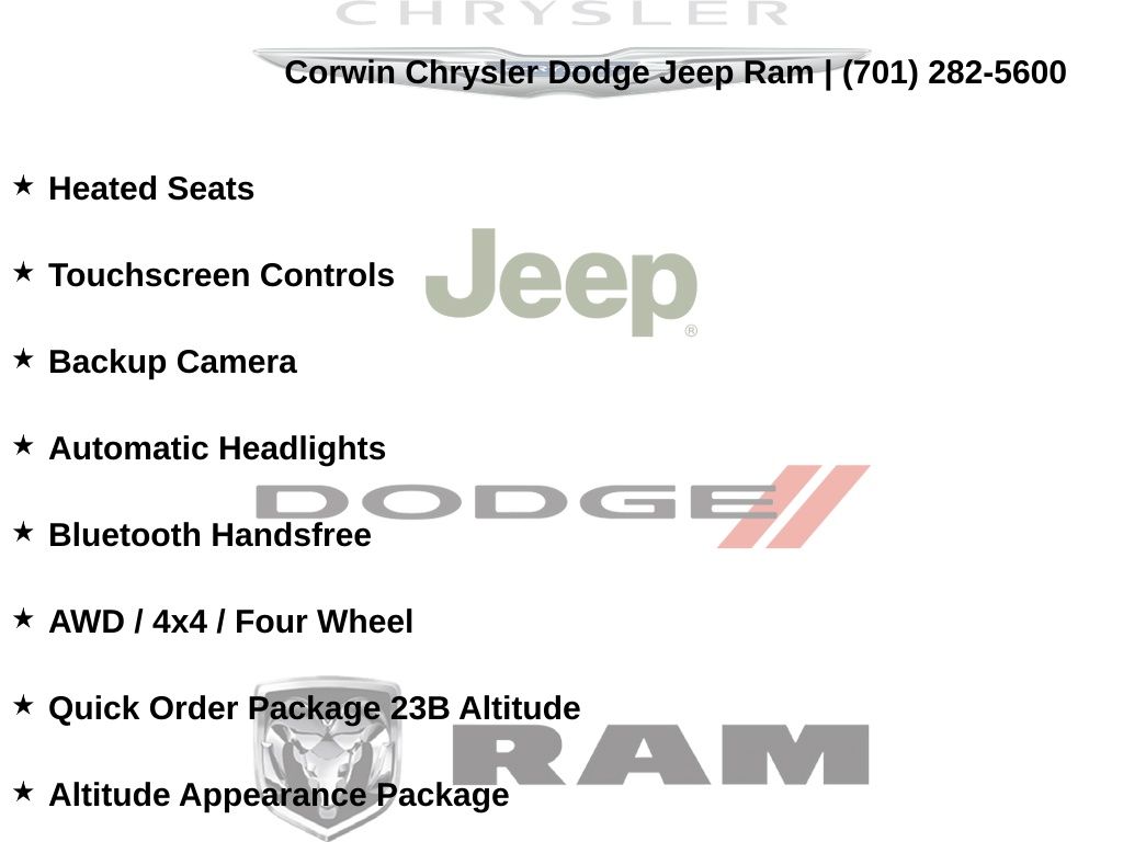 LETS MARCH INTO SPRING AT CORWIN CHRYSLER DODGE JEEP RAM OF FARGO!! WE HAVE SAVINGS ON ALL OF OUR PRE-OWNED VEHICLES AVAILABLE!! WE HAVE ONE OF THE LARGEST SELECTIONS OF INVENTORIES IN OUR AREA AT ONE SINGLE LOCATION!! Recent Arrival! Priced below KBB Fair Purchase Price! Bright White Clearcoat 2023 Jeep Grand Cherokee Altitude FACTORY CERTIFIED 4D Sport Utility 4WD 3.6L V6 24V VVT Certified. CARFAX One-Owner. Clean CARFAX.
