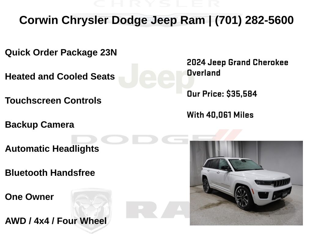 HAPPY JANUARY FROM CORWIN CHRYSLER DODGE JEEP RAM OF FARGO!! WE HAVE SAVINGS ON ALL OF OUR PRE-OWNED VEHICLES AVAILABLE!! WE HAVE ONE OF THE LARGEST SELECTIONS OF INVENTORIES IN OUR AREA AT ONE SINGLE LOCATION!! Priced below KBB Fair Purchase Price! Bright White Clearcoat 2024 Jeep Grand Cherokee Overland FACTORY CERTIFIED 4D Sport Utility 4WD 3.6L V6 24V VVT Certified. CARFAX One-Owner. Clean CARFAX.
