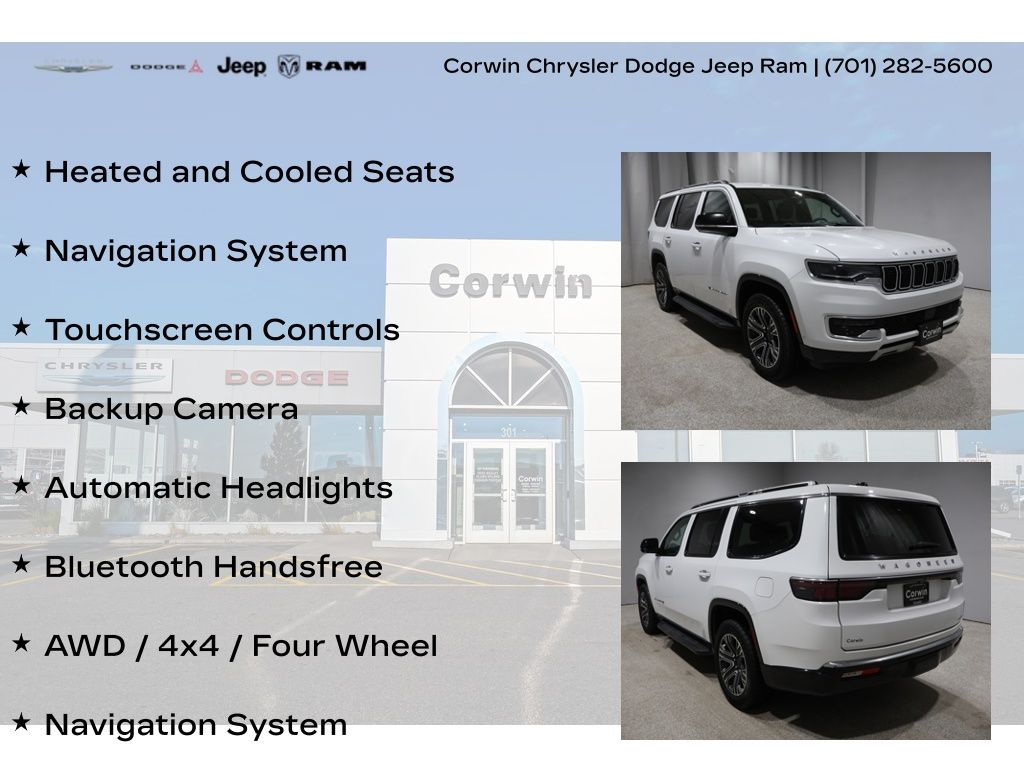 This Jeep Wagoneer is well equipped and includes these key features and benefits, Heated and Cooled Seats, Navigation System, Touchscreen Controls, Backup Camera, Automatic Headlights, Bluetooth Handsfree, AWD / 4x4 / Four Wheel, Heated front seats, Navigation System, Quick Order Package 25J, Ventilated front seats.