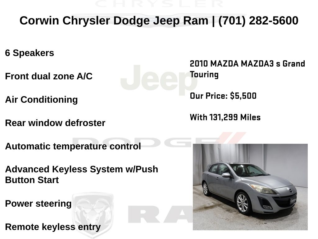 HAPPY HOLIDAYS FROM CORWIN CHRYSLER DODGE JEEP RAM OF FARGO!! WE HAVE STOCKINGS FULL OF SAVINGS ON ALL OF OUR PRE-OWNED VEHICLES AVAILABLE!! WE HAVE ONE OF THE LARGEST SELECTION OF INVENTORIES IN OUR AREA AT ONE SINGLE LOCATION!! Priced below KBB Fair Purchase Price! Liquid Silver Metallic 2010 Mazda Mazda3 s Grand Touring 4D Hatchback FWD 2.5L 4-Cylinder DOHC 16V VVT Clean CARFAX.