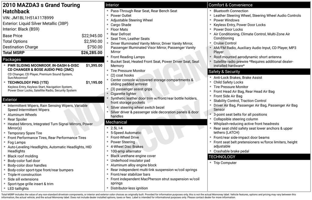 This Mazda Mazda3 is well equipped and includes these key features and benefits, Local Trade, HATCHBACK, 6 Speakers, Advanced Keyless System w/Push Button Start, Air Conditioning, AM/FM/CD/MP3 Compatible Audio System, Automatic temperature control, BOSE Audio System, Compact Navigation, Four wheel independent suspension, Front dual zone A/C, In-Dash 6-Disc CD Changer - MP3 Compatible, Memory seat, Moonroof, 6-CD & Bose Audio System, Perimeter Alarm, Power driver seat, Power Sliding-Glass Moonroof w/Interior Sunshade, Power steering, Power windows, Rear window defroster, Remote keyless entry, SIRIUS Satellite Radio, Speed-sensing steering, Steering wheel mounted audio controls, Technology Package, Traction control. 22/29 City/Highway MPG
