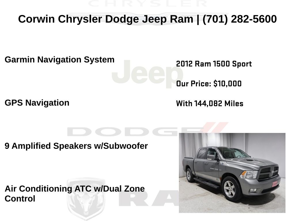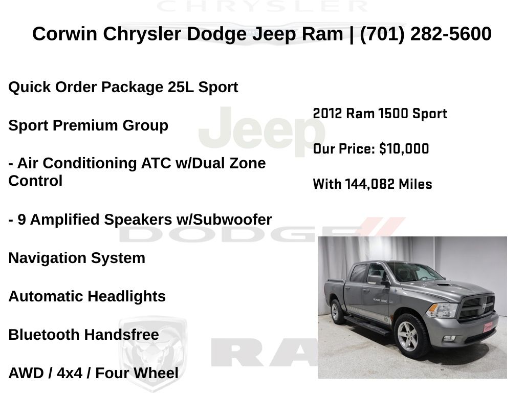 WELCOME TO DECEMBER AT CORWIN CHRYSLER DODGE JEEP RAM OF FARGO!! WE HAVE GREAT SAVINGS ON ALL OF OUR PRE-OWNED VEHICLES AVAILABLE!! WE HAVE ONE OF THE LARGEST SELECTIONS OF INVENTORIES IN OUR AREA AT ONE SINGLE LOCATION!! Priced below KBB Fair Purchase Price! Mineral Gray Metallic Clearcoat 2012 Ram 1500 Sport 4D Crew Cab 4WD HEMI 5.7L V8 Multi Displacement VVT Clean CARFAX.