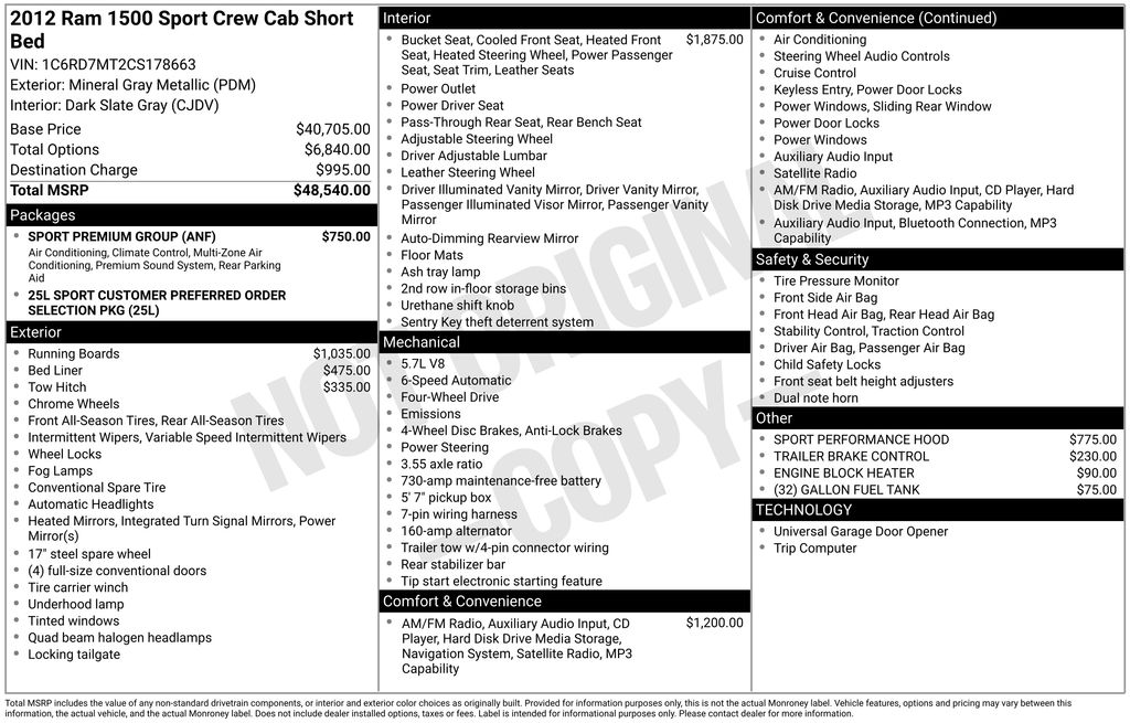 This Ram 1500 is well equipped and includes these key features and benefits, Navigation System, Automatic Headlights, Bluetooth Handsfree, AWD / 4x4 / Four Wheel, 9 Amplified Speakers w/Subwoofer, Air Conditioning ATC w/Dual Zone Control, Garmin Navigation System, GPS Navigation, Quick Order Package 25L Sport, Sport Premium Group.