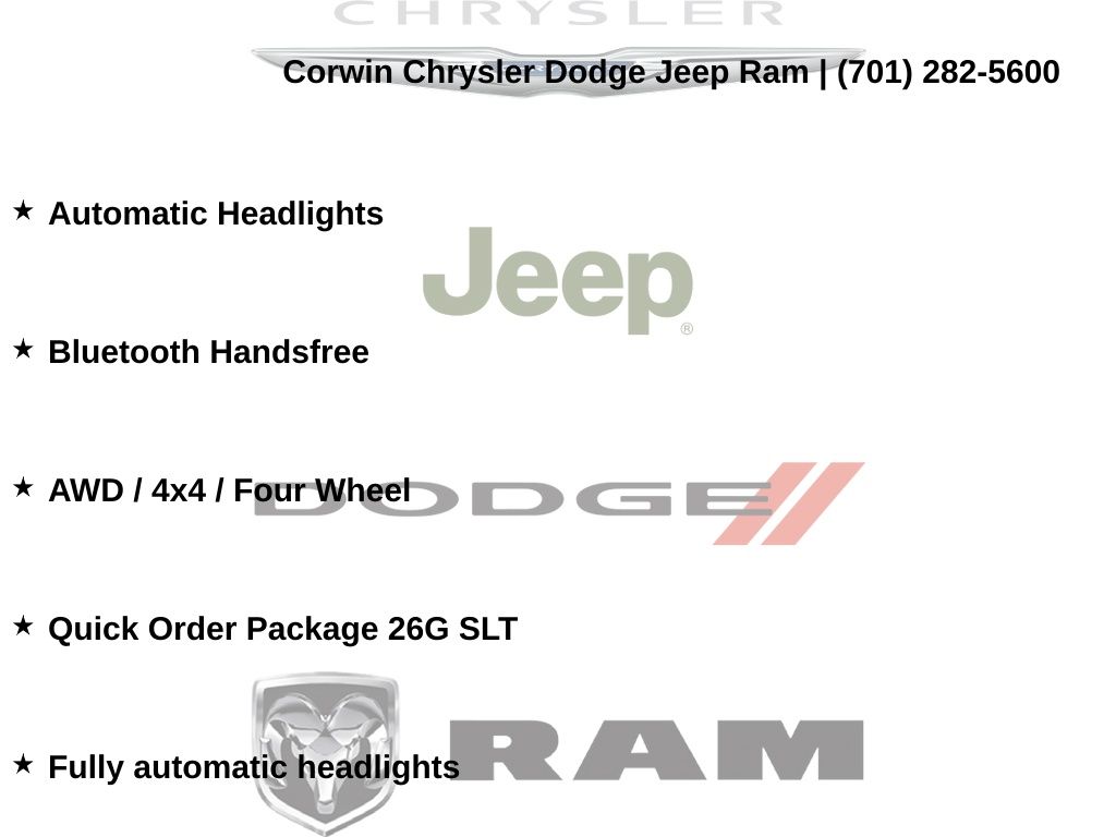 This Ram 1500 is well equipped and includes these key features and benefits, Automatic Headlights, Bluetooth Handsfree, AWD / 4x4 / Four Wheel, Fully automatic headlights, Quick Order Package 26G SLT.