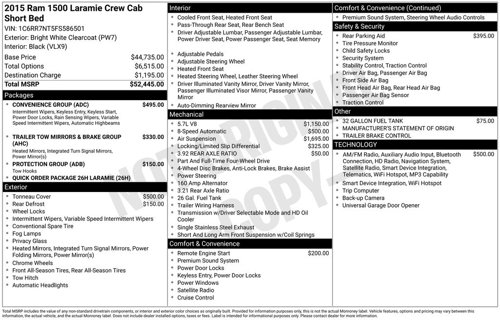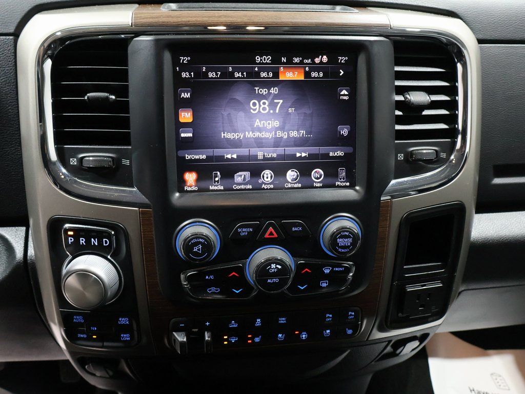 This Ram 1500 is well equipped and includes these key features and benefits, Heated and Cooled Seats, Navigation System, Touchscreen Controls, Backup Camera, Automatic Headlights, Bluetooth Handsfree, AWD / 4x4 / Four Wheel, Auto High Beam Headlamp Control, Convenience Group, Fully automatic headlights, GPS Navigation, Heated Front Seats, Keyless Enter-N-Go, Power Chrome Trailer Tow Mirrors, Protection Group, Quick Order Package 26H Laramie, Rain Sensitive Windshield Wipers, Remote Proximity Keyless Entry, Tow Hooks, Trailer Brake Control, Trailer Tow Mirrors, Trailer Tow Mirrors & Brake Group, Ventilated Front Seats.