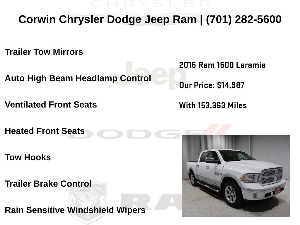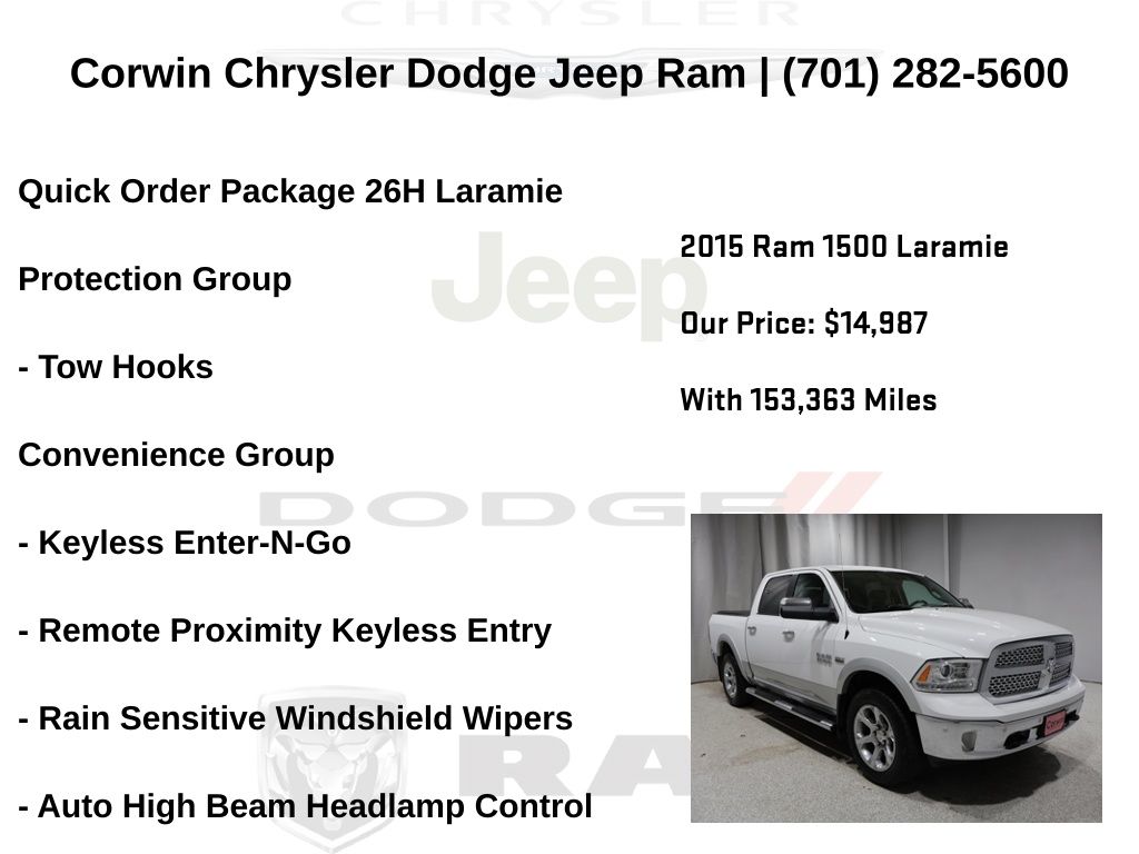 WELCOME TO DECEMBER AT CORWIN CHRYSLER DODGE JEEP RAM OF FARGO!! WE HAVE GREAT SAVINGS ON ALL OF OUR PRE-OWNED VEHICLES AVAILABLE!! WE HAVE ONE OF THE LARGEST SELECTION OF INVENTORIES IN OUR AREA AT ONE SINGLE LOCATION!! Priced below KBB Fair Purchase Price! Bright White Clearcoat 2015 Ram 1500 Laramie 4D Crew Cab 4WD HEMI 5.7L V8 Multi Displacement VVT Clean CARFAX.