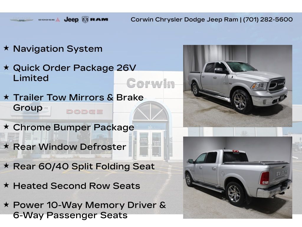 HAPPY JANUARY FROM CORWIN CHRYSLER DODGE JEEP RAM OF FARGO! WE HAVE SAVINGS ON ALL OF OUR PRE-OWNED VEHICLES AVAILABLE! WE HAVE ONE OF THE LARGEST SELECTIONS OF INVENTORIES IN OUR AREA AT ONE SINGLE LOCATION! Recent Arrival! Bright Silver Metallic Clearcoat 2017 Ram 1500 Limited 4D Crew Cab 4WD HEMI 5.7L V8 Multi Displacement VVT CARFAX One-Owner.