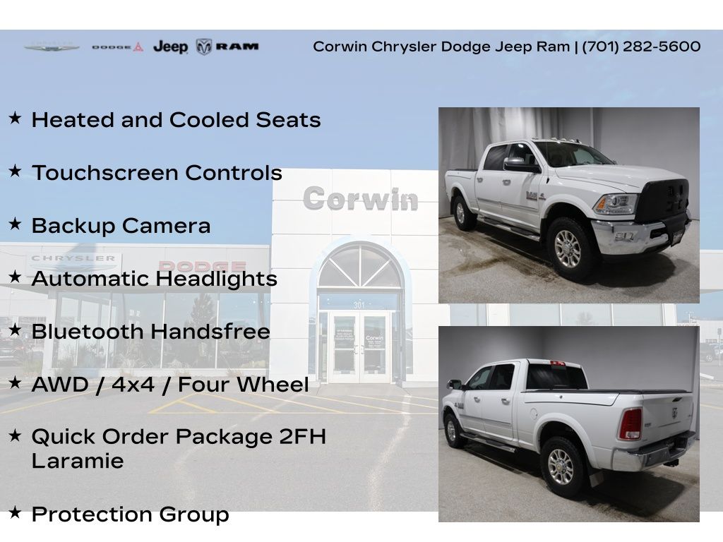 This Ram 2500 is well equipped and includes these key features and benefits, Heated and Cooled Seats, Touchscreen Controls, Backup Camera, Automatic Headlights, Bluetooth Handsfree, AWD / 4x4 / Four Wheel, 10 Speakers, Cold Weather Group, Engine Block Heater, Front Armrest w/Cupholders, Heated front seats, Protection Group, Quick Order Package 2FH Laramie, Radio: Uconnect 3C w/8.4" Display, Ventilated front seats, Winter Front Grille Cover.