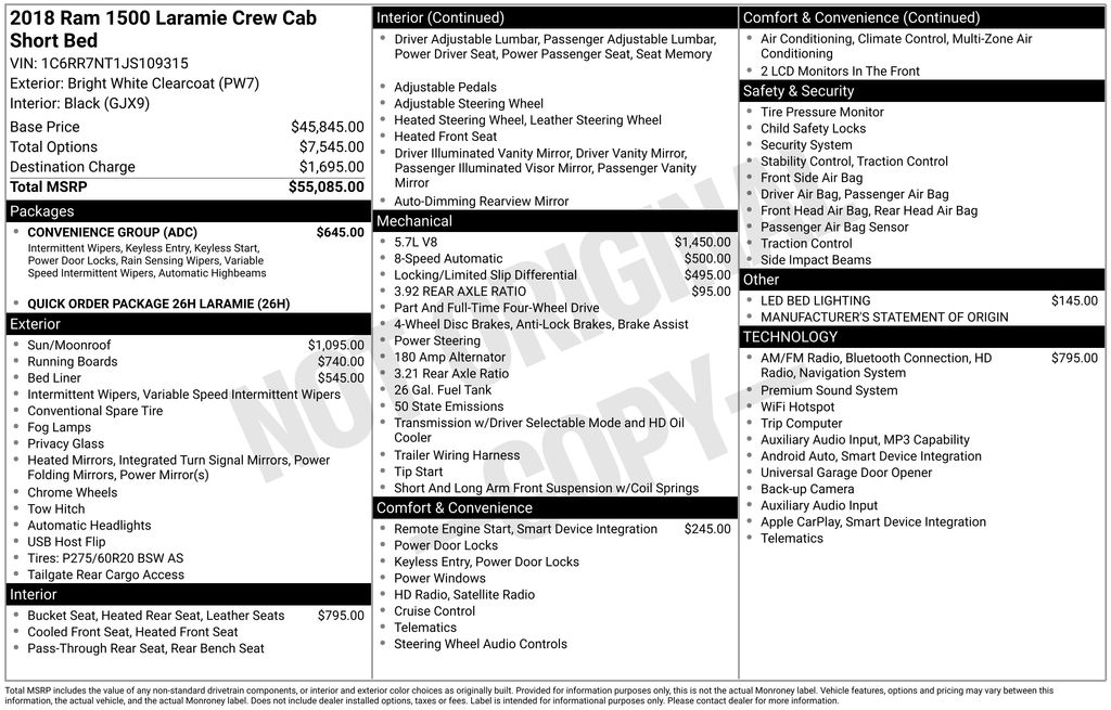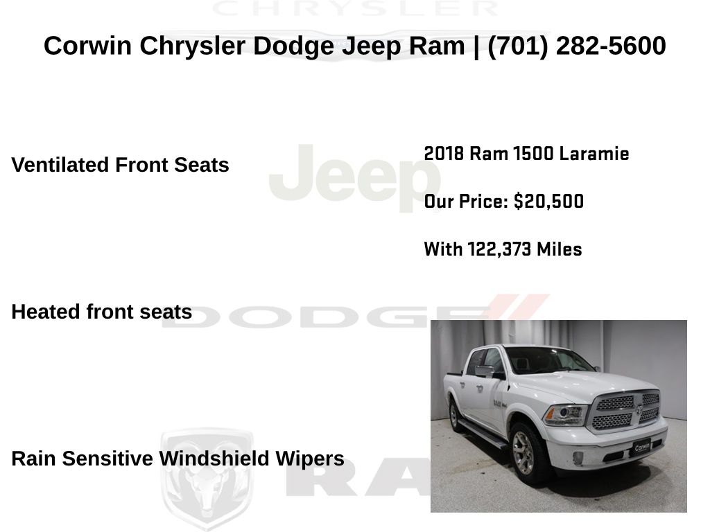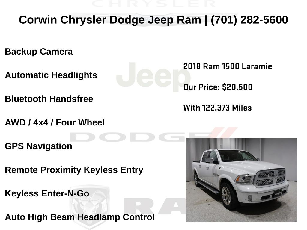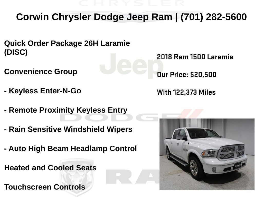 DECEMBER IS HERE AT CORWIN CHRYSLER DODGE JEEP RAM OF FARGO!! WE HAVE STOCKINGS FULL OF SAVINGS ON ALL OF OUR PRE-OWNED VEHICLES AVAILABLE!! WE HAVE ONE OF THE LARGEST SELECTION OF INVENTORIES IN OUR AREA AT ONE SINGLE LOCATION!! Priced below KBB Fair Purchase Price! Bright White Clearcoat 2018 Ram 1500 Laramie 4D Crew Cab 4WD HEMI 5.7L V8 Multi Displacement VVT