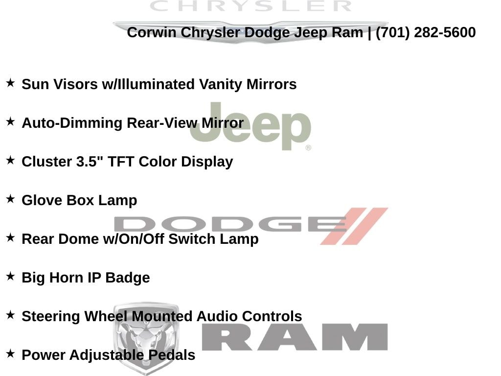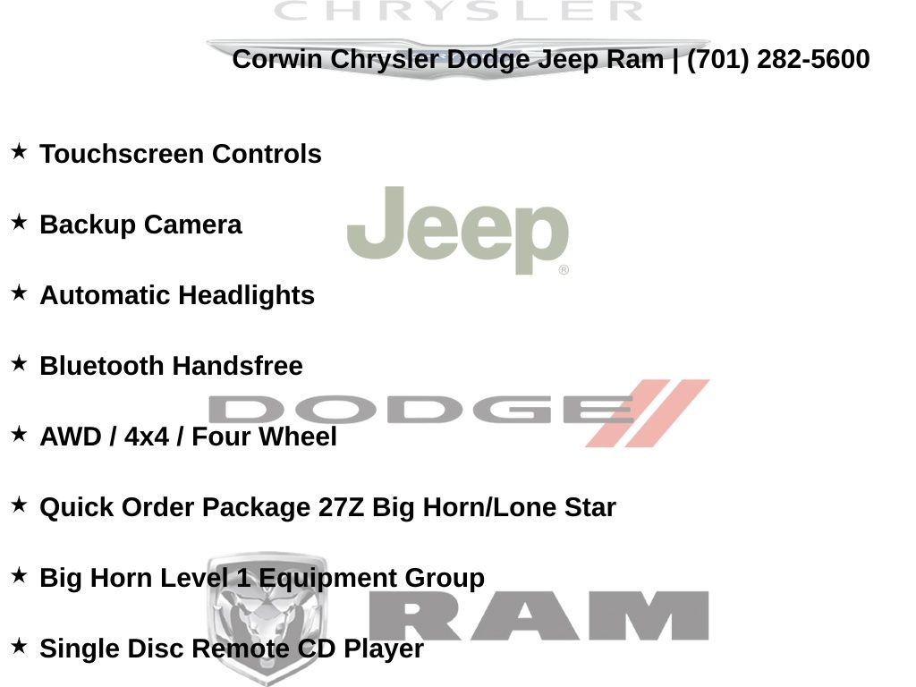 This Ram 1500 is well equipped and includes these key features and benefits, Touchscreen Controls, Backup Camera, Automatic Headlights, Bluetooth Handsfree, AWD / 4x4 / Four Wheel, Auto-Dimming Rear-View Mirror, Big Horn IP Badge, Big Horn Level 1 Equipment Group, Class IV Receiver Hitch, Cluster 3.5" TFT Color Display, Foam Bottle Insert (Door Trim Panel), Glove Box Lamp, Power 4-Way Driver Lumbar Adjust, Power 8-Way Driver Seat, Power Adjustable Pedals, Power Heated Fold Away Mirrors, Quick Order Package 27Z Big Horn/Lone Star, Radio: Uconnect 4 w/8.4" Display, Rear Dome w/On/Off Switch Lamp, Rear Power Sliding Window, Rear Window Defroster, Single Disc Remote CD Player, SiriusXM Satellite Radio, Steering Wheel Mounted Audio Controls, Sun Visors w/Illuminated Vanity Mirrors, Universal Garage Door Opener. Odometer is 33625 miles below market average!