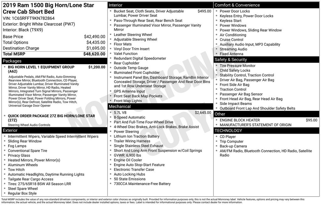 WELCOME TO DECEMBER AT CORWIN CHRYSLER DODGE JEEP RAM OF FARGO!! WE HAVE GREAT SAVINGS ON ALL OF OUR PRE-OWNED VEHICLES AVAILABLE!! WE HAVE ONE OF THE LARGEST SELECTION OF INVENTORIES IN OUR AREA AT ONE SINGLE LOCATION!! Recent Arrival! Priced below KBB Fair Purchase Price! Bright White Clearcoat 2019 Ram 1500 Big Horn/Lone Star 4D Crew Cab 4WD HEMI 5.7L V8 Multi Displacement VVT Clean CARFAX.