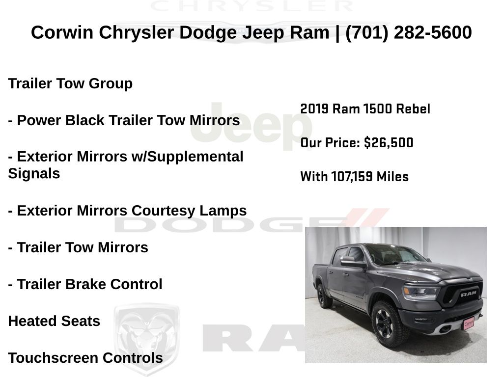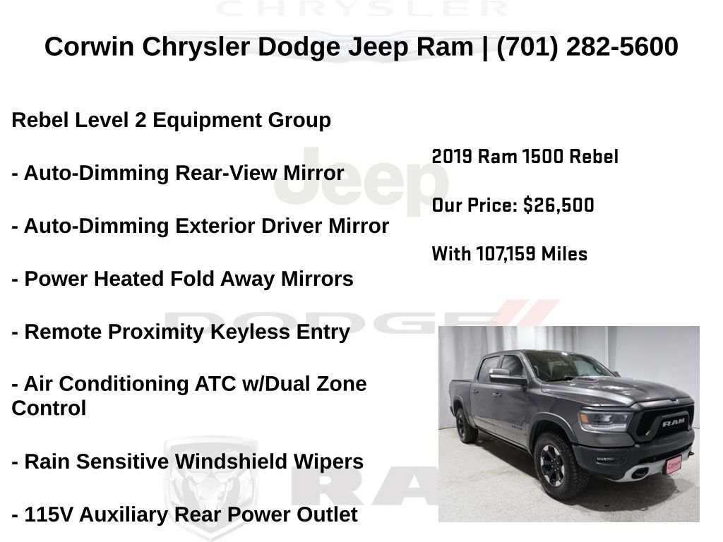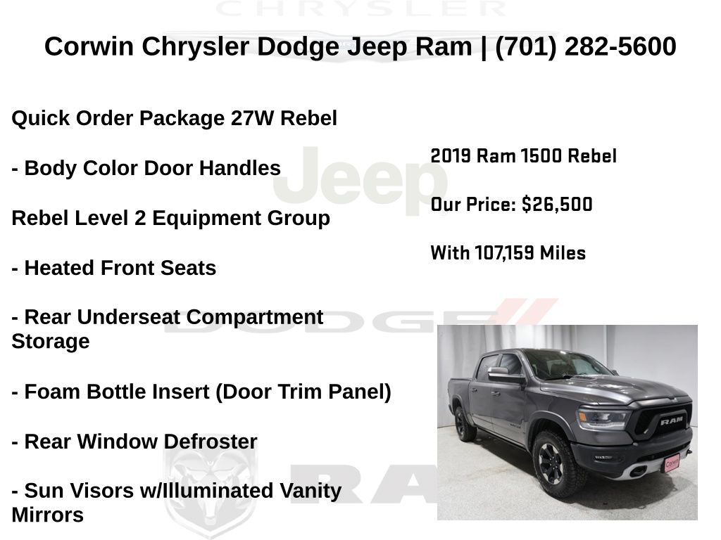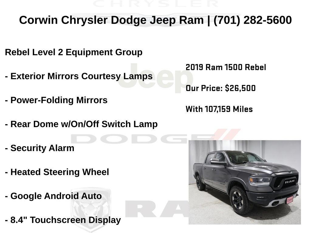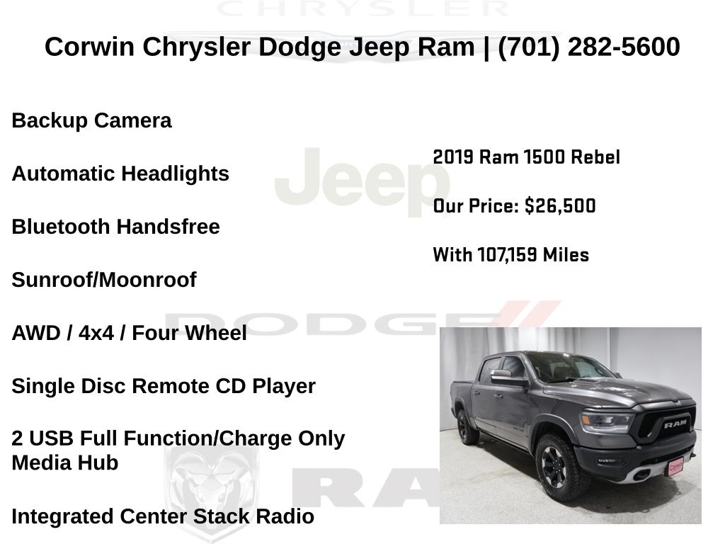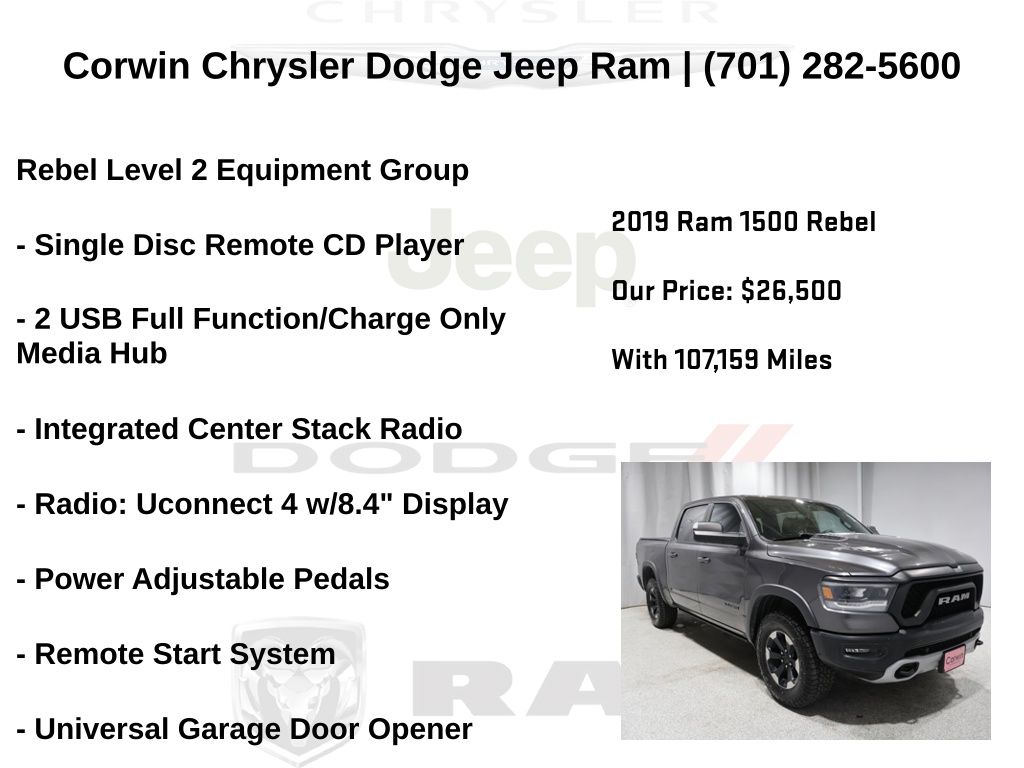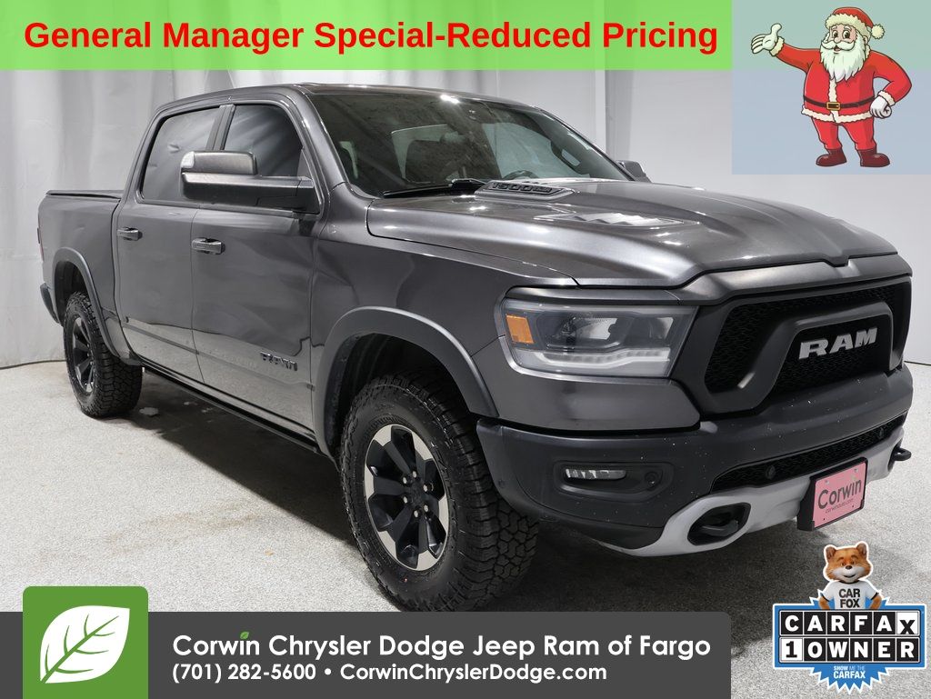 WELCOME TO DECEMBER AT CORWIN CHRYSLER DODGE JEEP RAM OF FARGO!! WE HAVE GREAT SAVINGS ON ALL OF OUR PRE-OWNED VEHICLES AVAILABLE!! WE HAVE ONE OF THE LARGEST SELECTIONS OF INVENTORIES IN OUR AREA AT ONE SINGLE LOCATION!! Priced below KBB Fair Purchase Price! Granite Crystal Metallic Clearcoat 2019 Ram 1500 Rebel 4D Crew Cab 4WD HEMI 5.7L V8 Multi Displacement VVT CARFAX One-Owner.