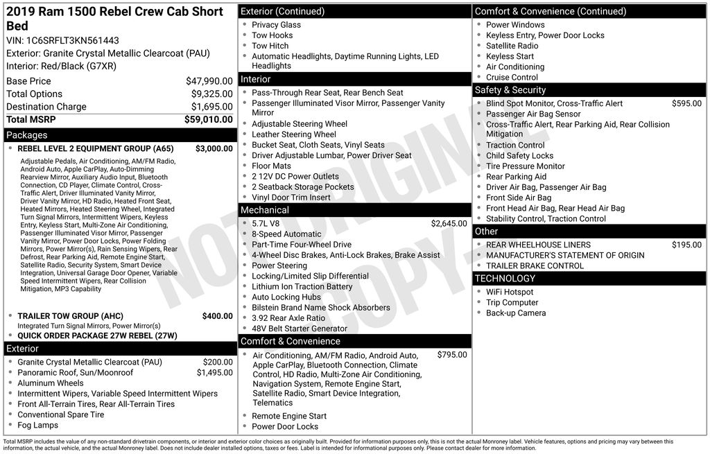 This Ram 1500 is well equipped and includes these key features and benefits, Heated Seats, Touchscreen Controls, Backup Camera, Automatic Headlights, Bluetooth Handsfree, Sunroof/Moonroof, AWD / 4x4 / Four Wheel, 115V Auxiliary Rear Power Outlet, 2 USB Full Function/Charge Only Media Hub, 8.4" Touchscreen Display, Air Conditioning ATC w/Dual Zone Control, Apple CarPlay, Auto-Dimming Exterior Driver Mirror, Auto-Dimming Rear-View Mirror, Body Color Door Handles, Dome Dual LED Reading Lamp, Dual-Pane Panoramic Sunroof, Exterior Mirrors Courtesy Lamps, Exterior Mirrors w/Supplemental Signals, Foam Bottle Insert (Door Trim Panel), Fully automatic headlights, Google Android Auto, Heated Front Seats, Heated Steering Wheel, Integrated Center Stack Radio, Overhead LED Lamps, ParkSense Front/Rear Park Assist w/Stop, ParkView Rear Back-Up Camera, Power Adjustable Pedals, Power Black Trailer Tow Mirrors, Power Heated Fold Away Mirrors, Power-Folding Mirrors, Premium Overhead Console, Quick Order Package 27W Rebel, Radio: Uconnect 4 w/8.4" Display, Rain Sensitive Windshield Wipers, Rear Dome w/On/Off Switch Lamp, Rear Underseat Compartment Storage, Rear Window Defroster, Rebel Level 2 Equipment Group, Remote Proximity Keyless Entry, Remote Start System, Security Alarm, Single Disc Remote CD Player, Sun Visors w/Illuminated Vanity Mirrors, Trailer Brake Control, Trailer Tow Group, Trailer Tow Mirrors, Universal Garage Door Opener.