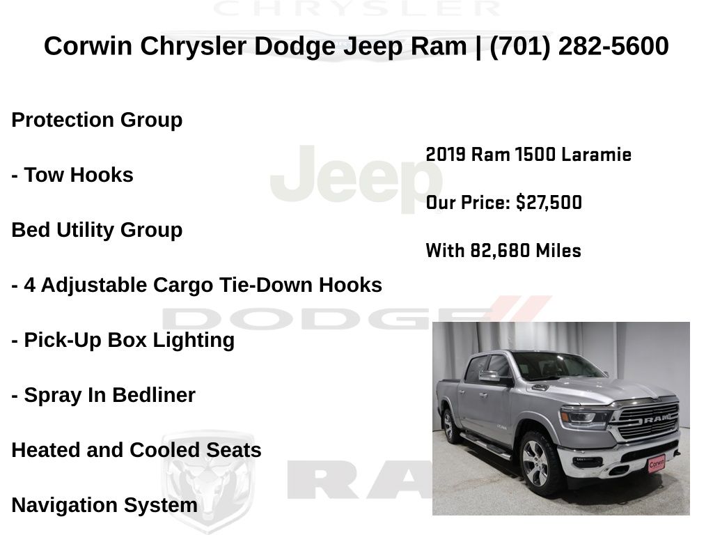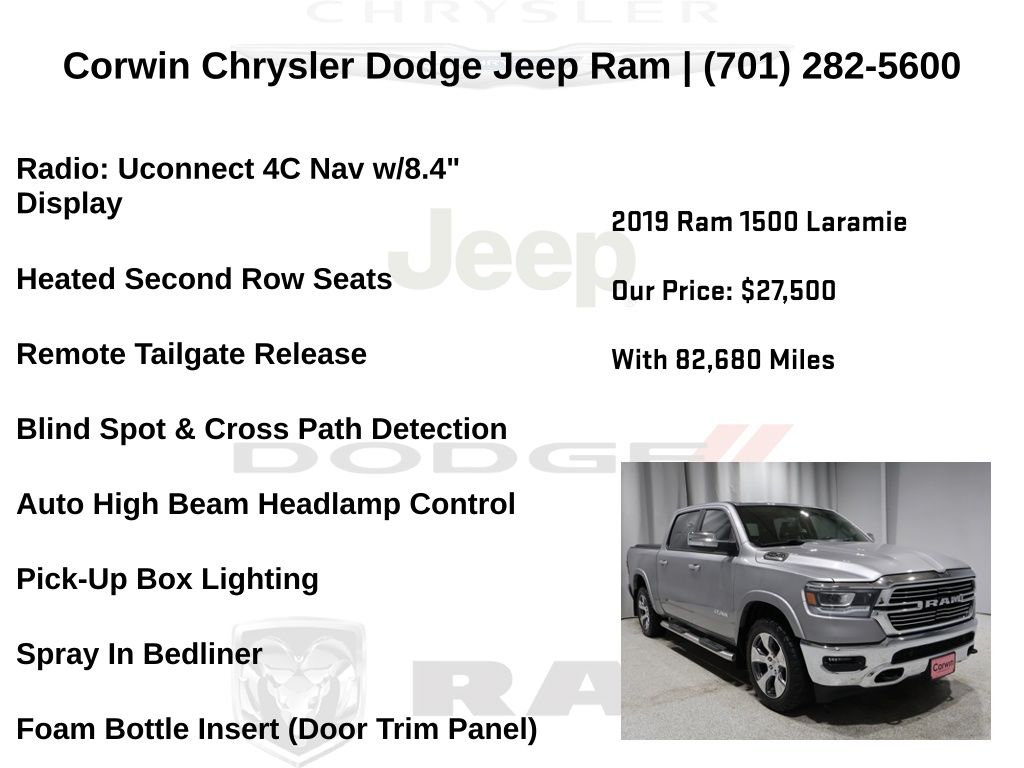 WELCOME TO DECEMBER AT CORWIN CHRYSLER DODGE JEEP RAM OF FARGO!! WE HAVE GREAT SAVINGS ON ALL OF OUR PRE-OWNED VEHICLES AVAILABLE!! WE HAVE ONE OF THE LARGEST SELECTION OF INVENTORIES IN OUR AREA AT ONE SINGLE LOCATION!! Priced below KBB Fair Purchase Price! Billet Silver Metallic Clearcoat 2019 Ram 1500 Laramie FACTORY CERTIFIED 4D Crew Cab 4WD HEMI 5.7L V8 Multi Displacement VVT Certified.