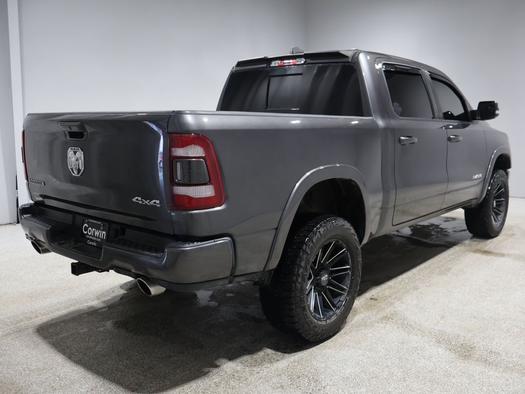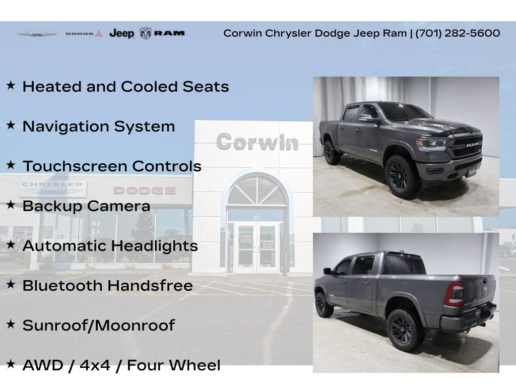 This Ram 1500 is well equipped and includes these key features and benefits, Heated and Cooled Seats, Navigation System, Touchscreen Controls, Backup Camera, Automatic Headlights, Bluetooth Handsfree, Sunroof/Moonroof, AWD / 4x4 / Four Wheel, 4 Adjustable Cargo Tie-Down Hooks, Auto High Beam Headlamp Control, Bed Utility Group, Black Interior Accents, Blind Spot & Cross Path Detection, Body Color Door Handles, Body Color Front Bumper, Body Color Rear Bumper w/Step Pads, Dome Dual LED Reading Lamp, Dual-Pane Panoramic Sunroof, Foam Bottle Insert (Door Trim Panel), GPS Navigation, Grille B/Color Outline 3 Texture 4, harman/kardon 19 Speaker Premium Sound, Heated Front Seats, Heated Second Row Seats, Laramie Level 2 Equipment Group, Leather Trimmed Bucket Seats, LED Dome/Reading Lamp, ParkSense Front/Rear Park Assist w/Stop, Pick-Up Box Lighting, Power Heated Fold-Away Mirrors, Power windows, Quick Order Package 25H Laramie, Radio: Uconnect 4C Nav w/8.4" Display, Rain Sensitive Windshield Wipers, Rear 60/40 Folding Split Recline Seat, Rear Underseat Compartment Storage, Remote Tailgate Release, Single Disc Remote CD Player, Sport Appearance Package, Sport Performance Hood, Spray In Bedliner, Tailgate Ajar Warning Lamp, Ventilated Front Seats, Wheels: 20" x 9" Premium Painted w/Inserts, Wireless Charging Pad. Odometer is 5848 miles below market average!