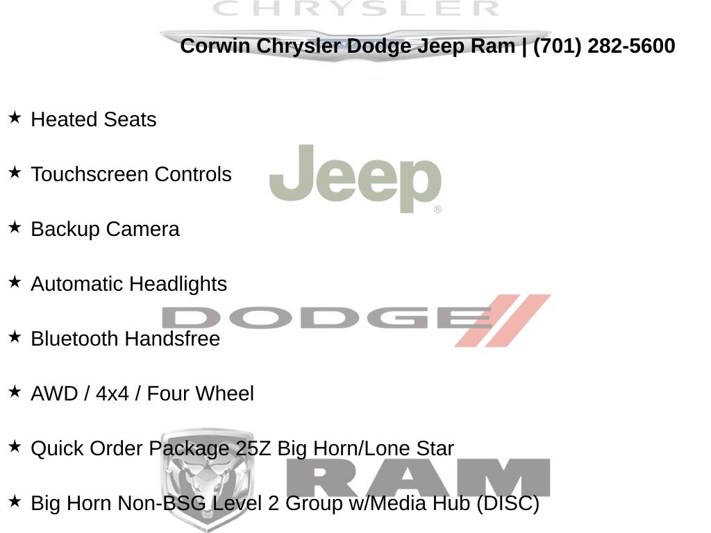 This Ram 1500 is well equipped and includes these key features and benefits, Heated Seats, Touchscreen Controls, Backup Camera, Automatic Headlights, Bluetooth Handsfree, AWD / 4x4 / Four Wheel, 1-Year SiriusXM Radio Service, 2 USB Full Function/Charge Only Media Hub, 8.4" Touchscreen Display, Add Class IV Receiver Hitch, Air Conditioning ATC w/Dual Zone Control, Apple CarPlay, Auto-Dimming Exterior Driver Mirror, Auto-Dimming Rear-View Mirror, Big Horn IP Badge, Big Horn Non-BSG Level 2 Group w/Media Hub (DISC), Class IV Receiver Hitch, Cluster 7.0" TFT Color Display, Dampened Tailgate, Exterior Mirrors Courtesy Lamps, Exterior Mirrors w/Supplemental Signals, Foam Bottle Insert (Door Trim Panel), For More Info, Call 800-643-2112, Front LED Fog Lamps, Glove Box Lamp, Google Android Auto, Heated Front Seats, Heated Steering Wheel, Integrated Center Stack Radio, LED Reflector Headlamps, LED Taillamps, ParkSense Front/Rear Park Assist w/Stop, Power 4-Way Driver Lumbar Adjust, Power 8-Way Driver Seat, Power Adjustable Pedals, Power Black Trailer Tow Mirrors, Power Heated Fold Away Mirrors, Power-Folding Mirrors, Premium Lighting Group, Quick Order Package 25Z Big Horn/Lone Star, Radio: Uconnect 4 w/8.4" Display, Rear Dome w/On/Off Switch Lamp, Rear Power Sliding Window, Rear Window Defroster, Security Alarm, Single Disc Remote CD Player, SiriusXM Satellite Radio, Steering Wheel Mounted Audio Controls, Sun Visors w/Illuminated Vanity Mirrors, Trailer Brake Control, Trailer Tow Group, Trailer Tow Mirrors, Universal Garage Door Opener. Odometer is 25078 miles below market average!