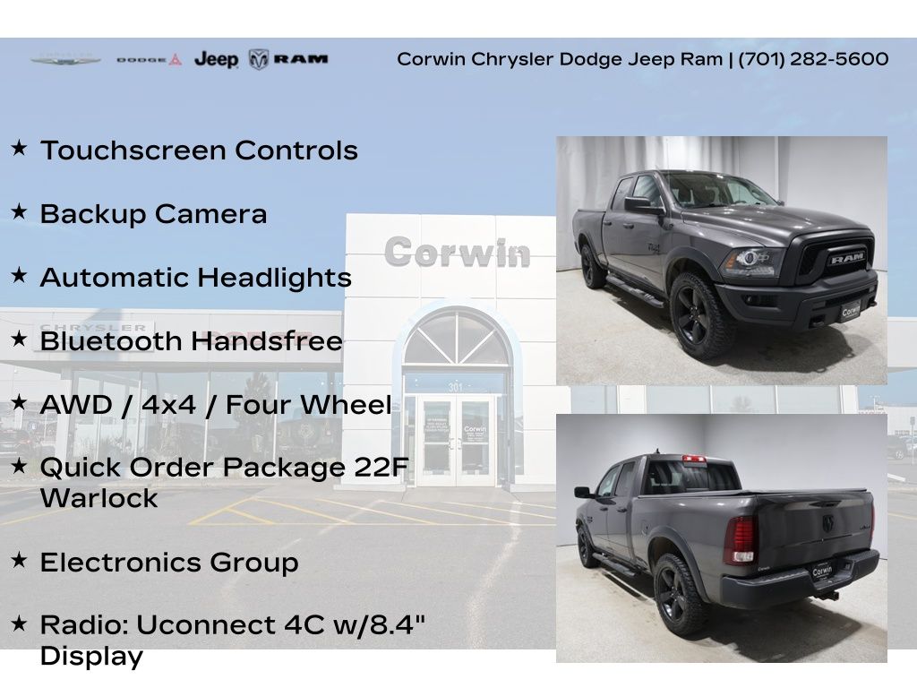 This Ram 1500 Classic is well equipped and includes these key features and benefits, Touchscreen Controls, Backup Camera, Automatic Headlights, Bluetooth Handsfree, AWD / 4x4 / Four Wheel, Bi-Function Halogen Projector Headlamps, Black Door Handles, Black Exterior Truck Badging, Black RAM Head Tailgate Badge, Cluster 7.0" TFT Color Display, Electronics Group, Front LED Fog Lamps, ParkSense Rear Park Assist System, Quick Order Package 22F Warlock, Radio: Uconnect 4C w/8.4" Display, Rear Extra HD Shock Absorbers, Rear Floor Mats, Semi-Gloss Black Hub, Sport Tail Lamps, Tow Hooks, Warlock, Warlock Decal, Wheels: 20" x 8" Semi-Gloss Black Aluminum. Odometer is 1253 miles below market average!