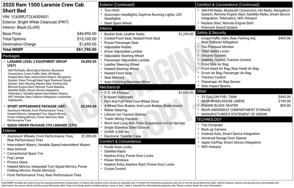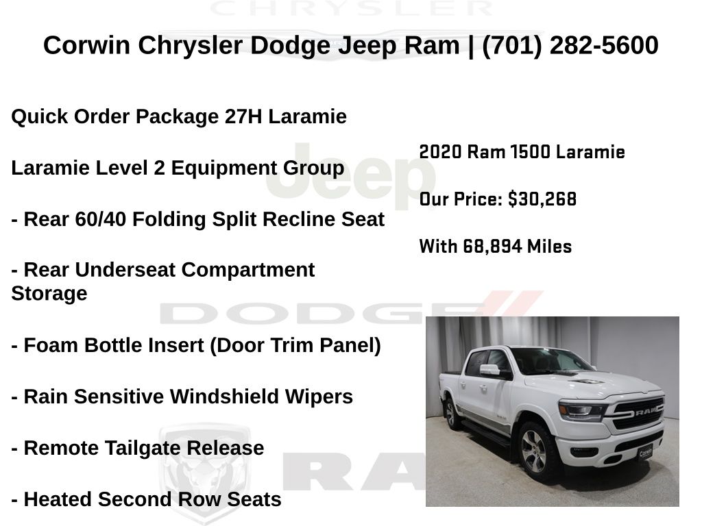 TIME TO SPRING INTO APRIL AT CORWIN CHRYSLER DODGE JEEP RAM OF FARGO!! WE HAVE SAVINGS ON ALL OF OUR PRE-OWNED VEHICLES AVAILABLE!! WE HAVE ONE OF THE LARGEST SELECTIONS OF INVENTORIES IN OUR AREA AT ONE SINGLE LOCATION !! Priced below KBB Fair Purchase Price! Bright White Clearcoat 2020 Ram 1500 Laramie 4D Crew Cab 4WD HEMI 5.7L V8 Multi Displacement VVT
